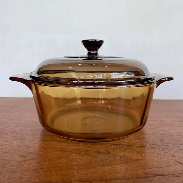 ◈ ビジョン VISION ◈ ◈ 強化耐熱ガラス蓋付き両手鍋 1.25ℓ ◈ フランス製 ガラスに刻印有り 透き通ったアンバー(琥珀)色がキッチンを彩る 中身が見える美しいガラス鍋。 煮る、炊く、焼く、炒める。 保温性がいいので冷めにくく、 火から下ろし食卓に出してもしばらくの間、グツグツしています。 何よりも調理中にも中が見えるので楽しくて便利です。 韓国ドラマの食卓にも時々登場します。 ♦ 熱衝撃に強い ♦ 電子レンジ ♦ オーブン ♦ 直火 匂いや汚れが残りにくく、衛生的にお使い頂けます。 《ビジョンの特長》 ❖ ガラス製なので鍋からの溶出物が無く、食べ物への影響がない。 ❖ 透明ガラスで料理の加減が一目でわかる。 ❖ 琥珀色のエレガントな鍋はそのまま食卓に。 ❖ 保湿性に優れ、ごく弱火でコトコト煮込むのも得意。 ❖ 直火、電子レンジ、オーブン使用可。 ❖ 素材の伸縮が無い為、加熱しても鍋底がそることが無い。 ◾️サイズ 幅(ハンドル含む) 約24.8cm 直径 約19㎝ 高さ 7.8㎝(蓋をして 約12.8㎝) 1274g ■注意点 ・こちらの品は未使用のまま自宅で保管していた品です。コンディションは非常に良好ですが、自宅保管品にご理解いただける方のみのご購入をお願いします。 ・ご不明な点がありましたら遠慮なくお問い合わせ下さい。 230614-07