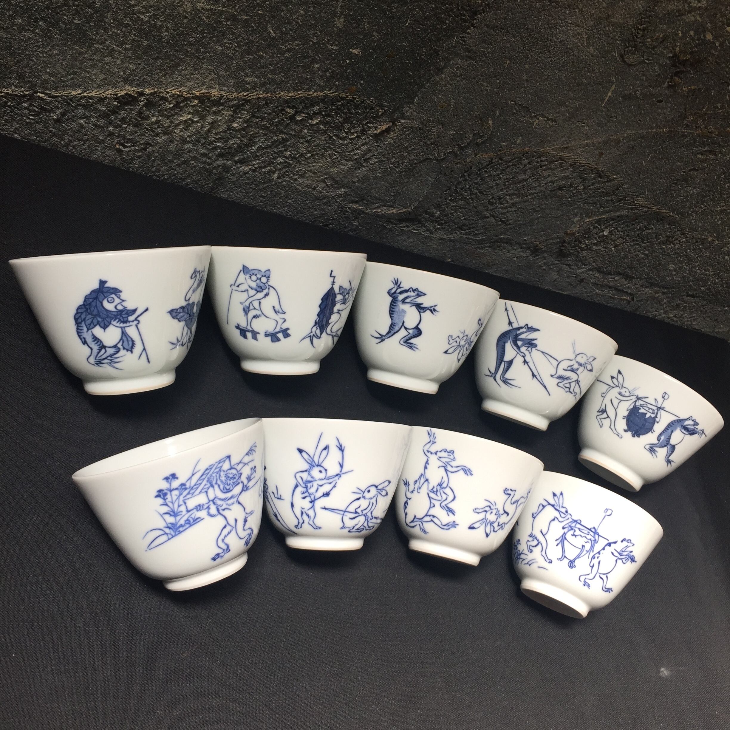 Japan Vintage 平安 吉兆 清水焼 高山寺 国宝絵巻 鳥獣戯画 湯呑 5pcs