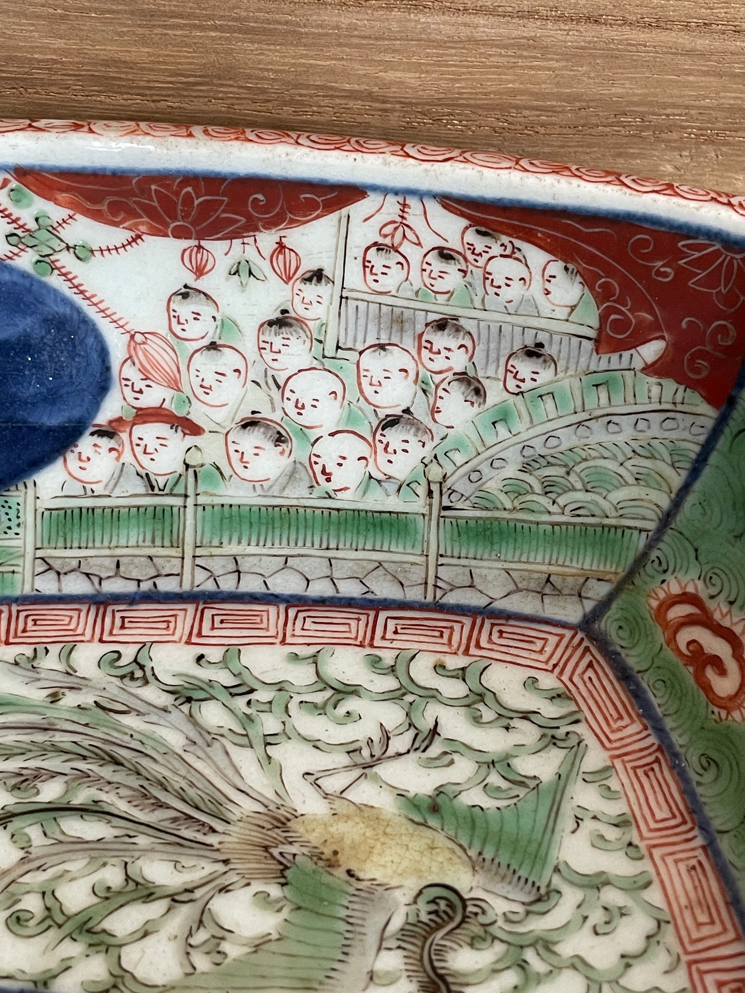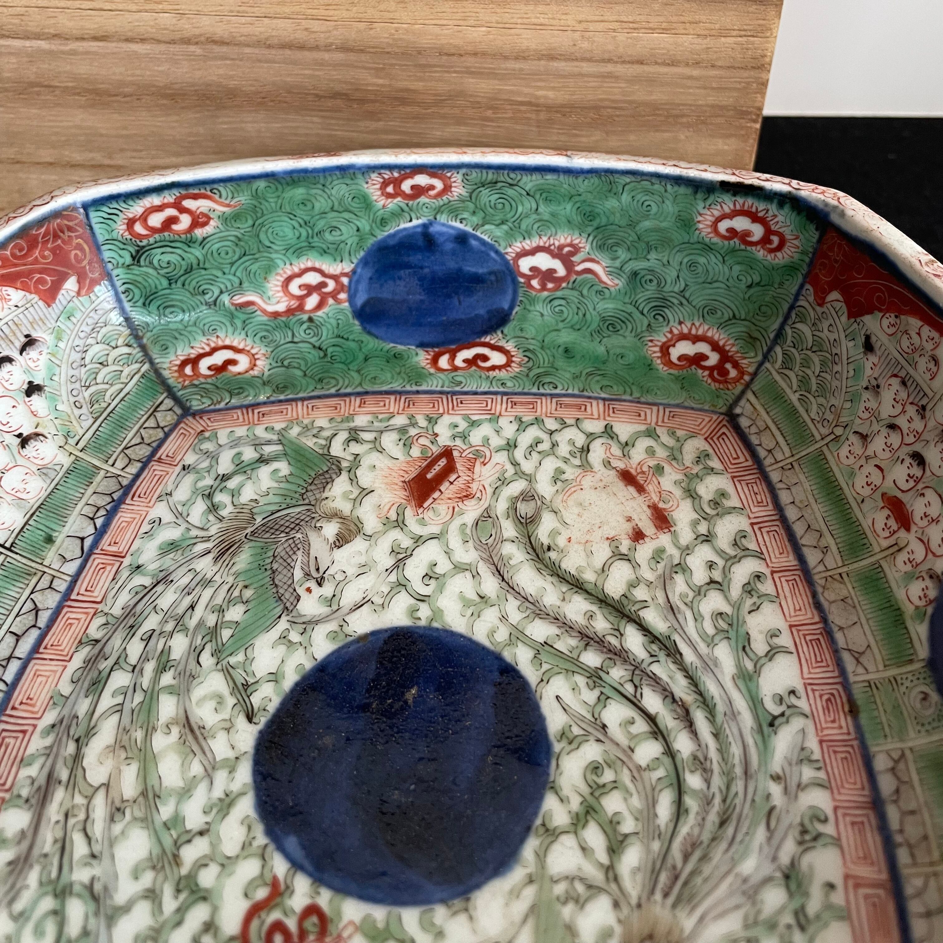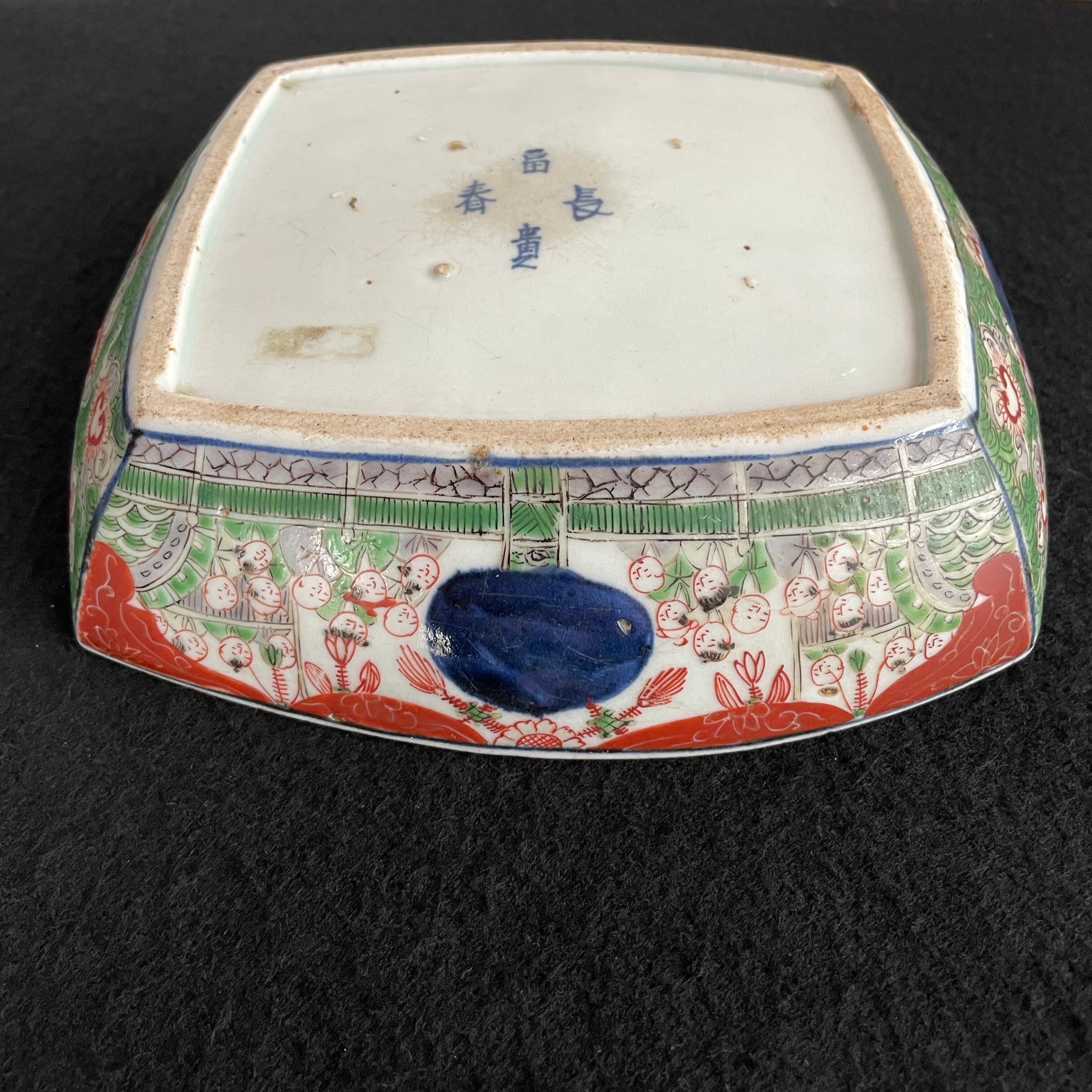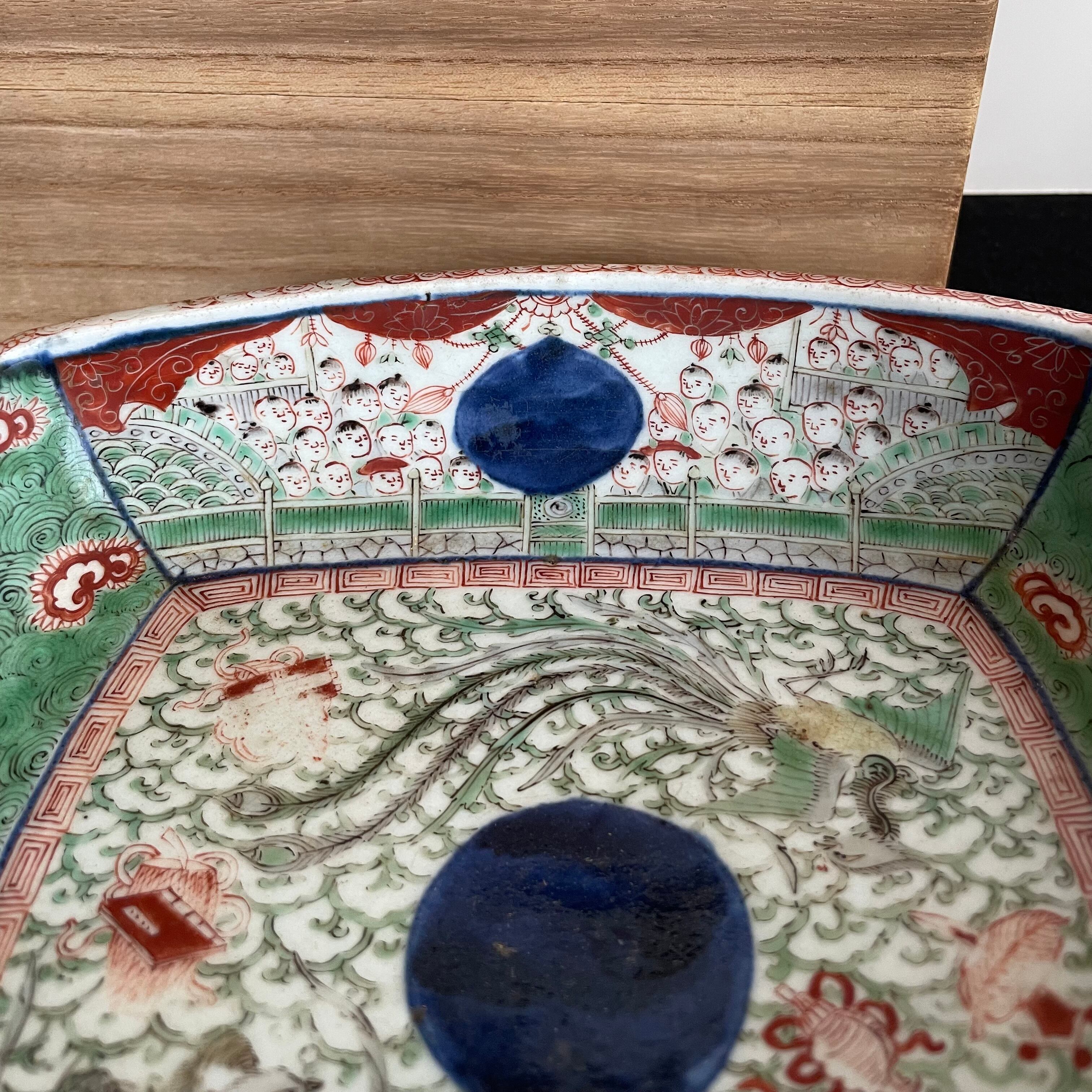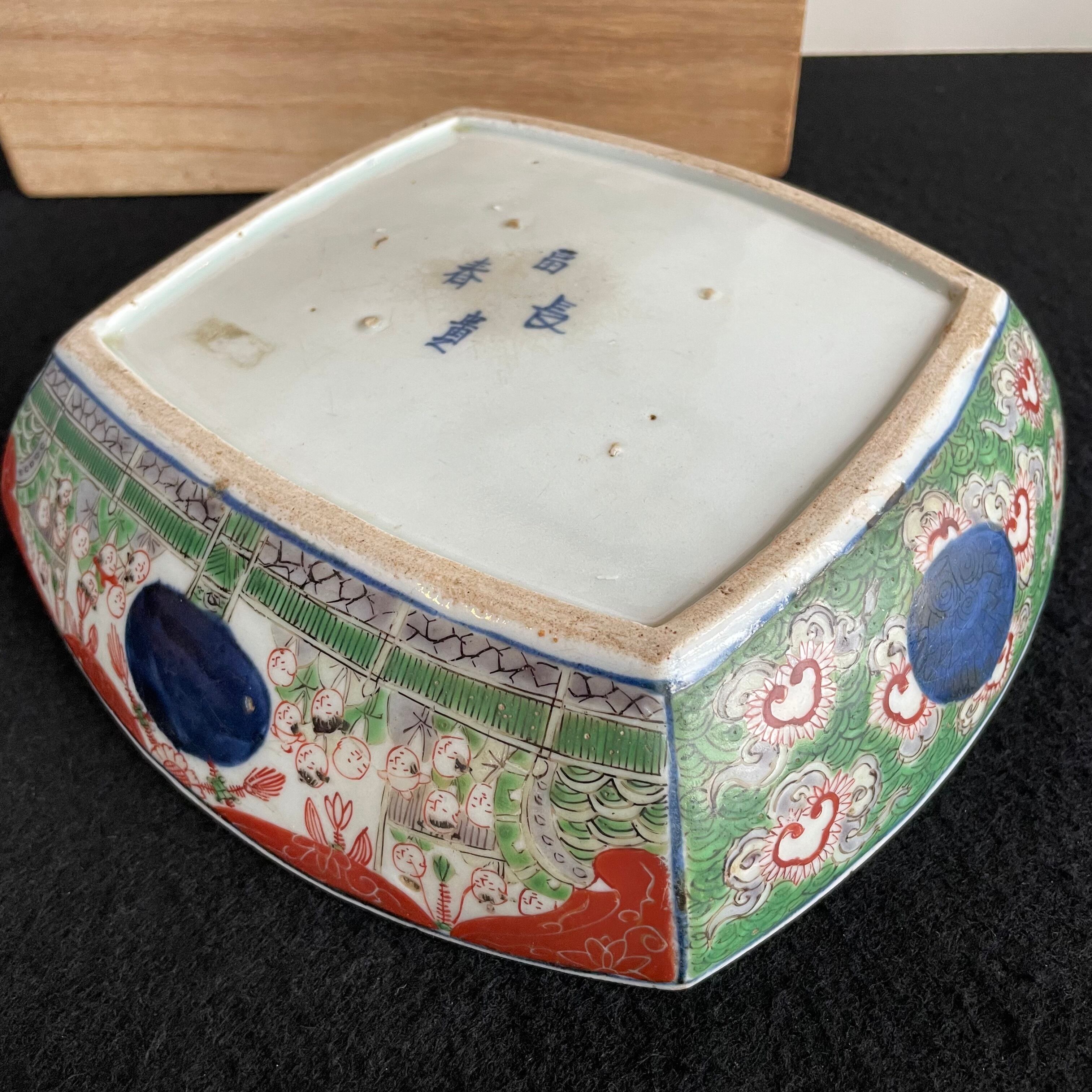 Japan Vintage 明治 大聖寺伊万里 金襴手 四方鉢 鳳凰唐人図 富貴長春銘 完品 盛鉢
