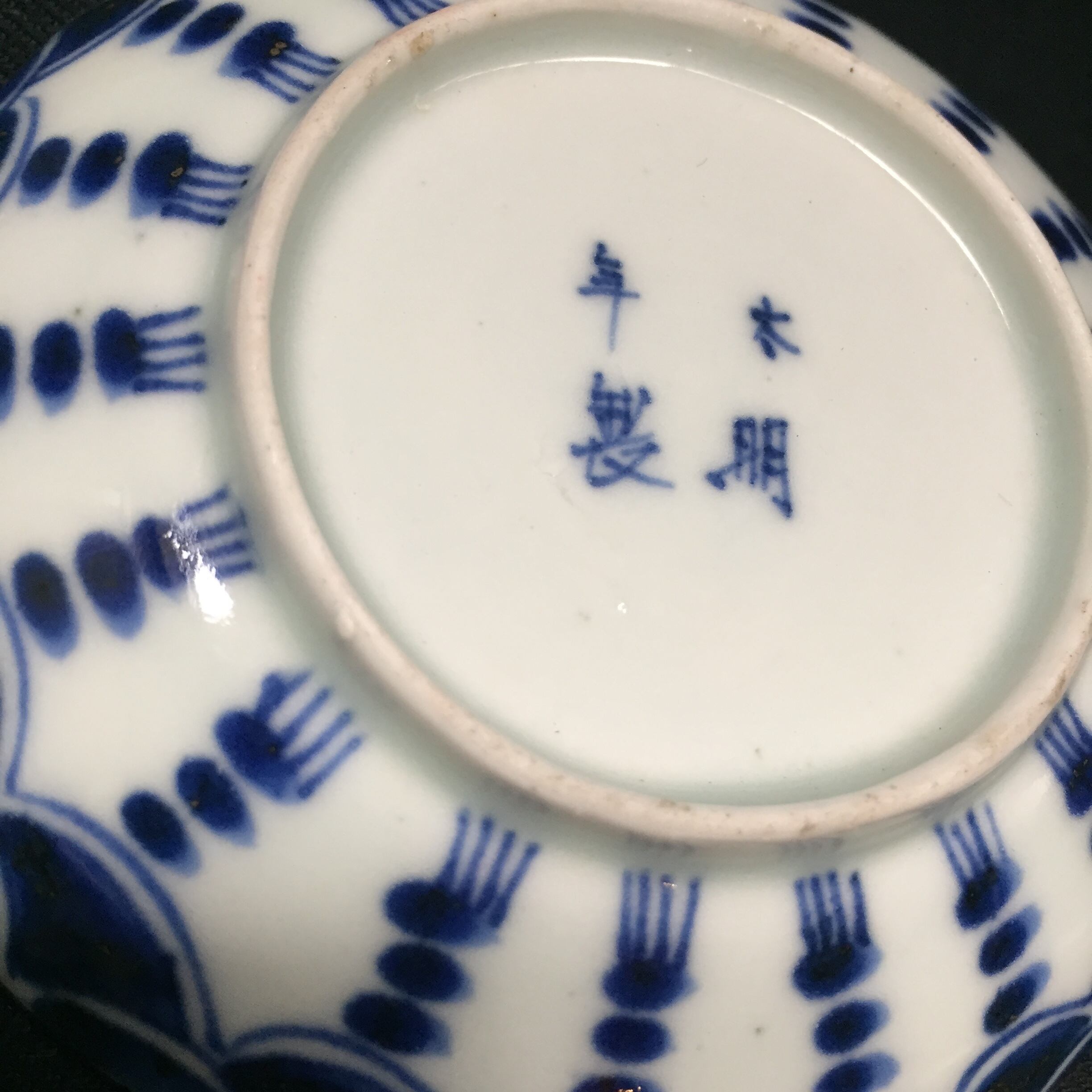 高台内側に「大明年製」と手描きされた小さな豆皿。