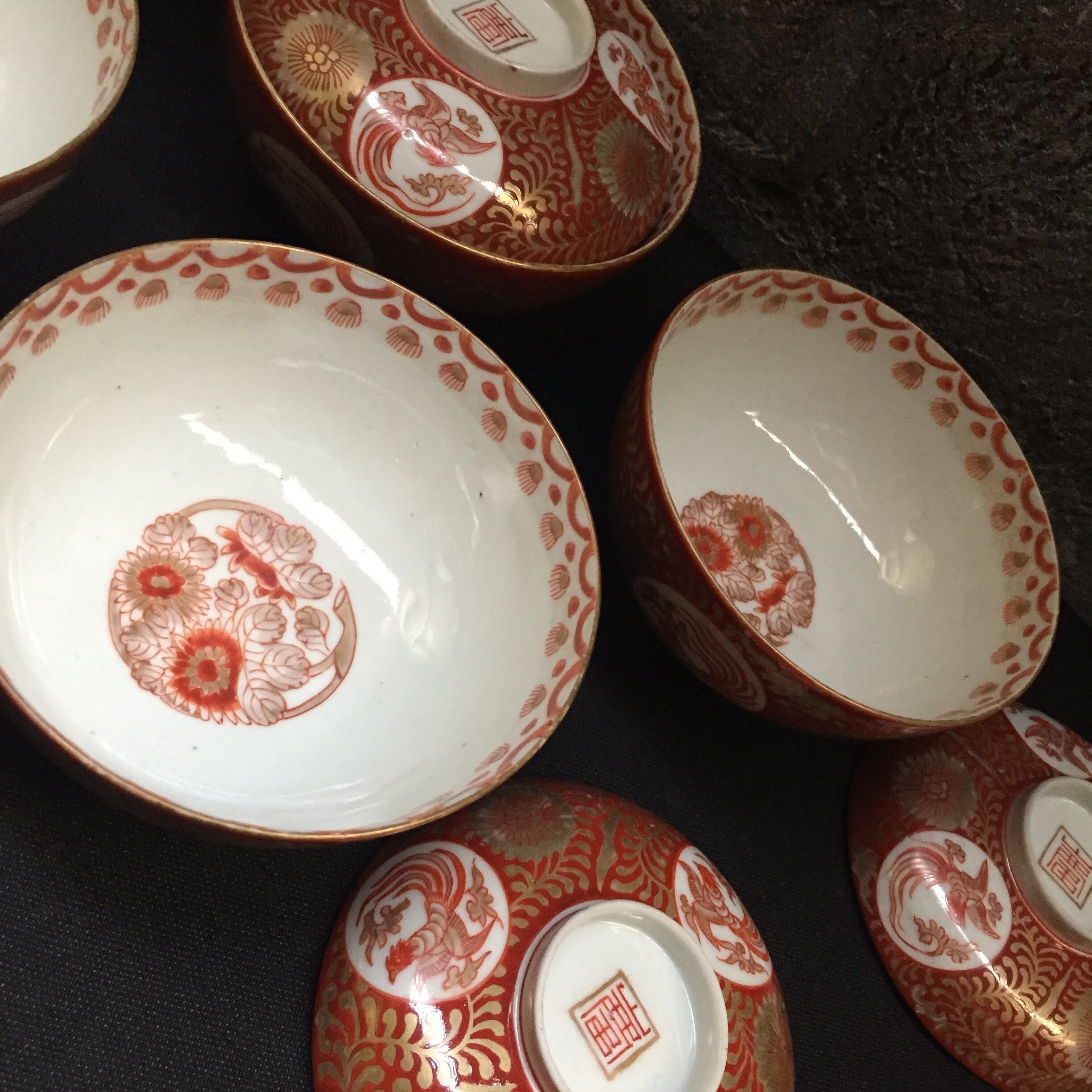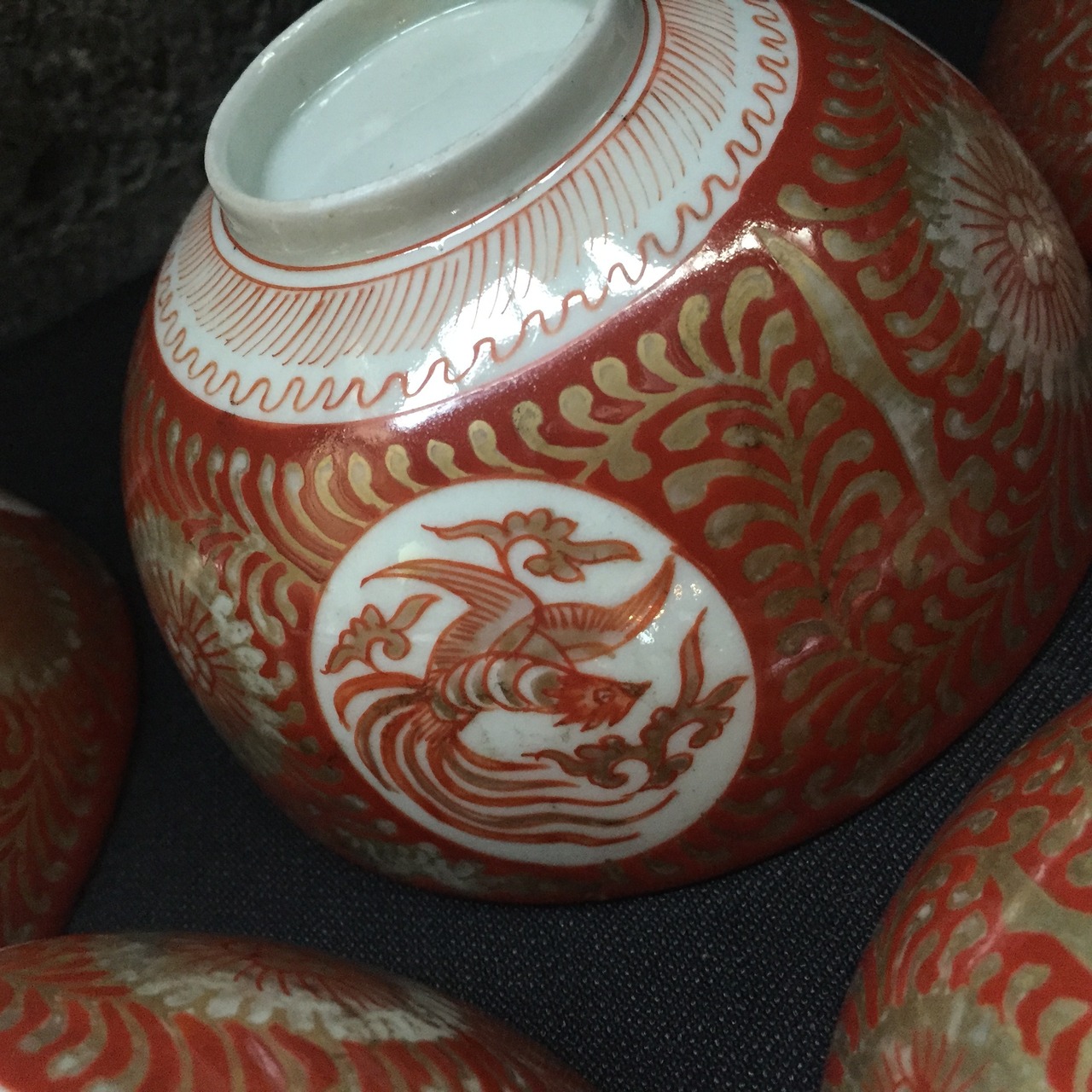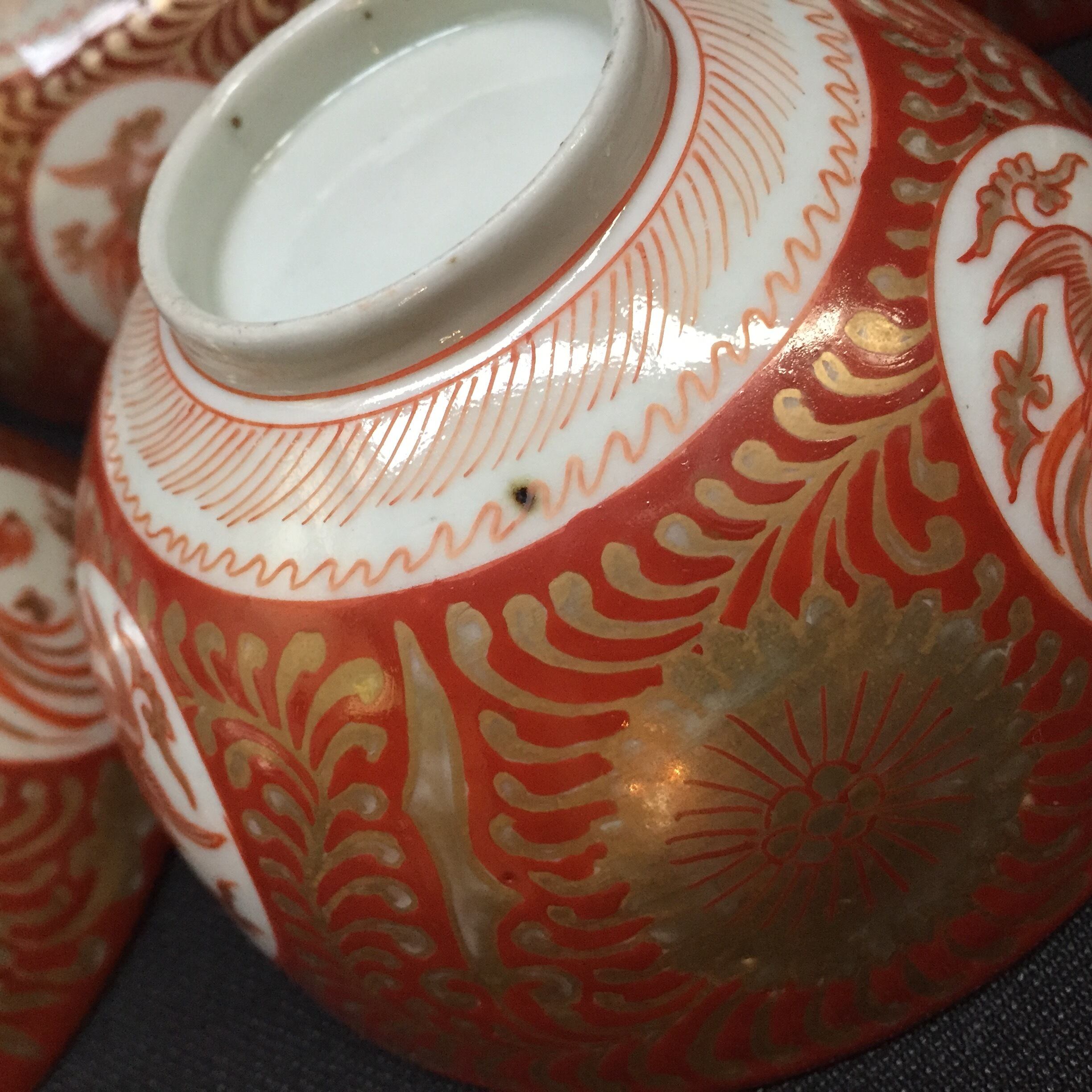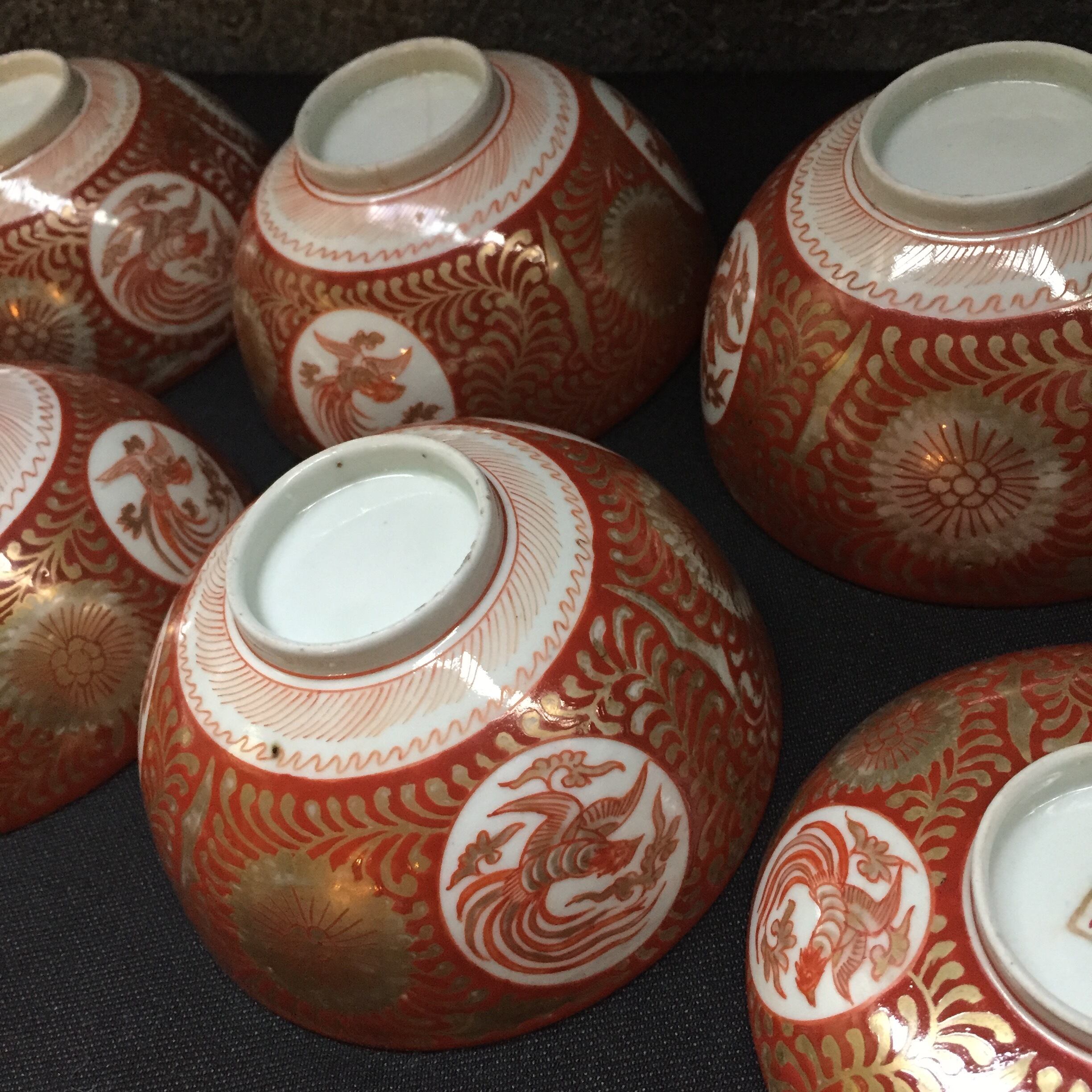Japan Vintage 明治 古 九谷 赤絵 金彩 金襴手 鳳凰 唐草花鳥 文 茶碗 蓋 在銘 5客