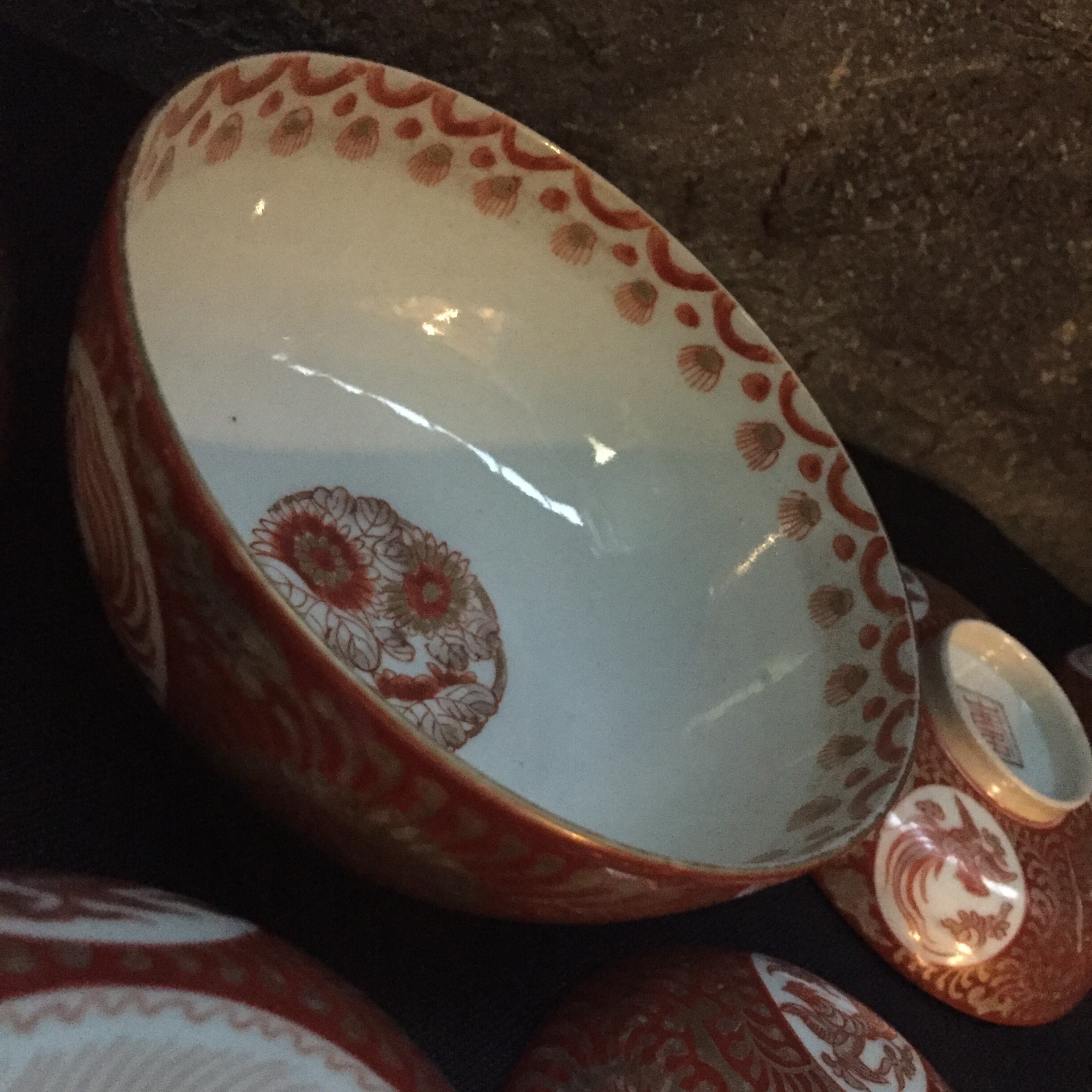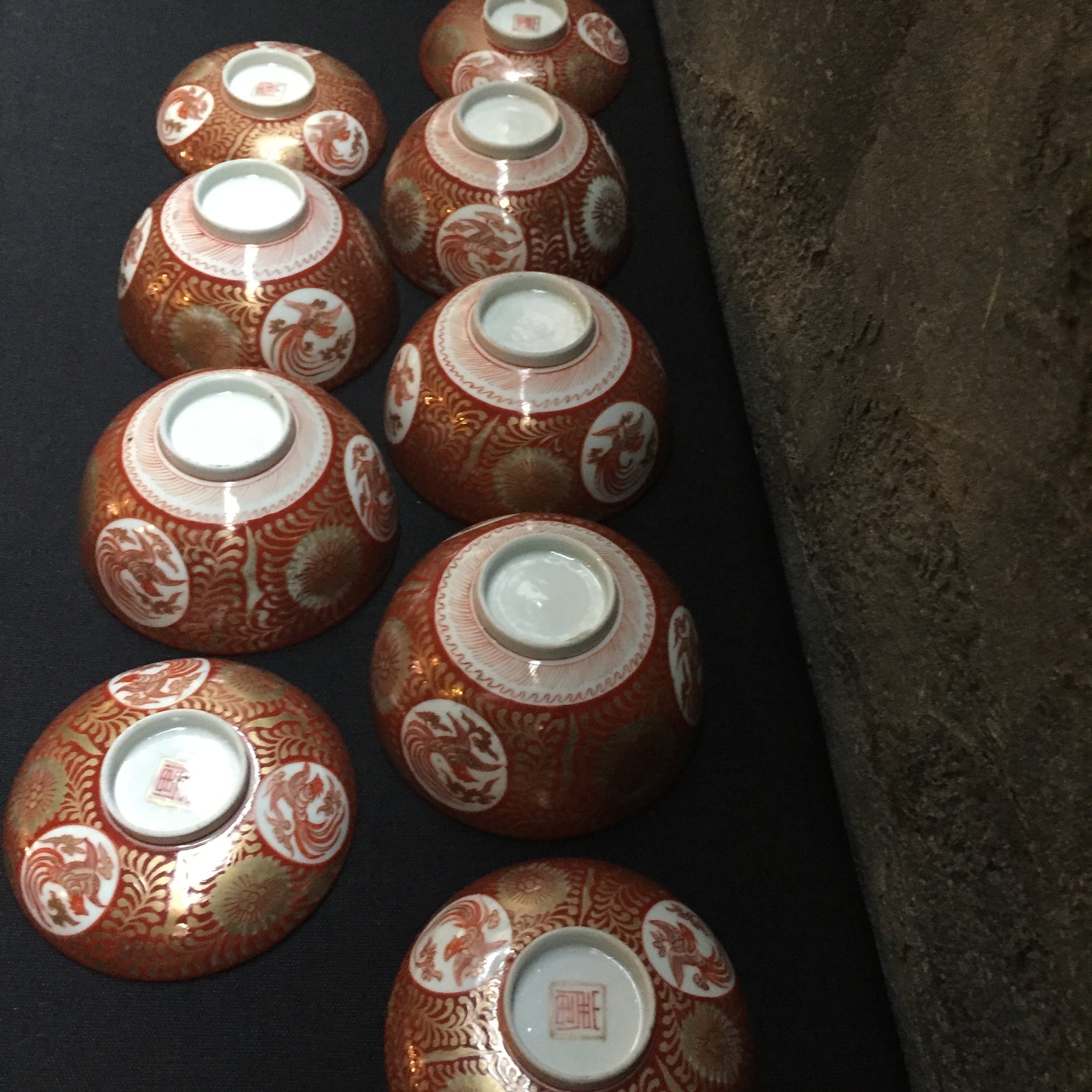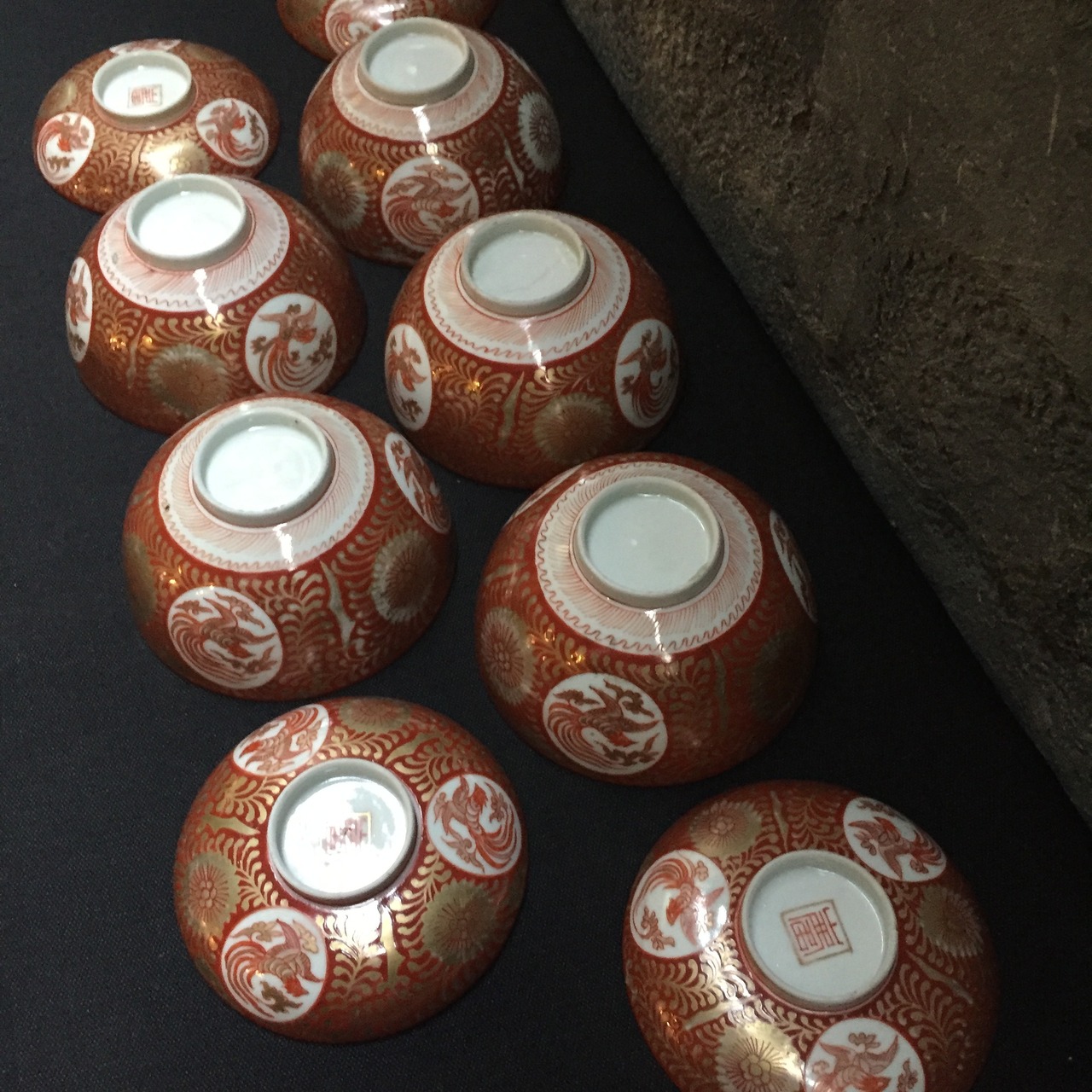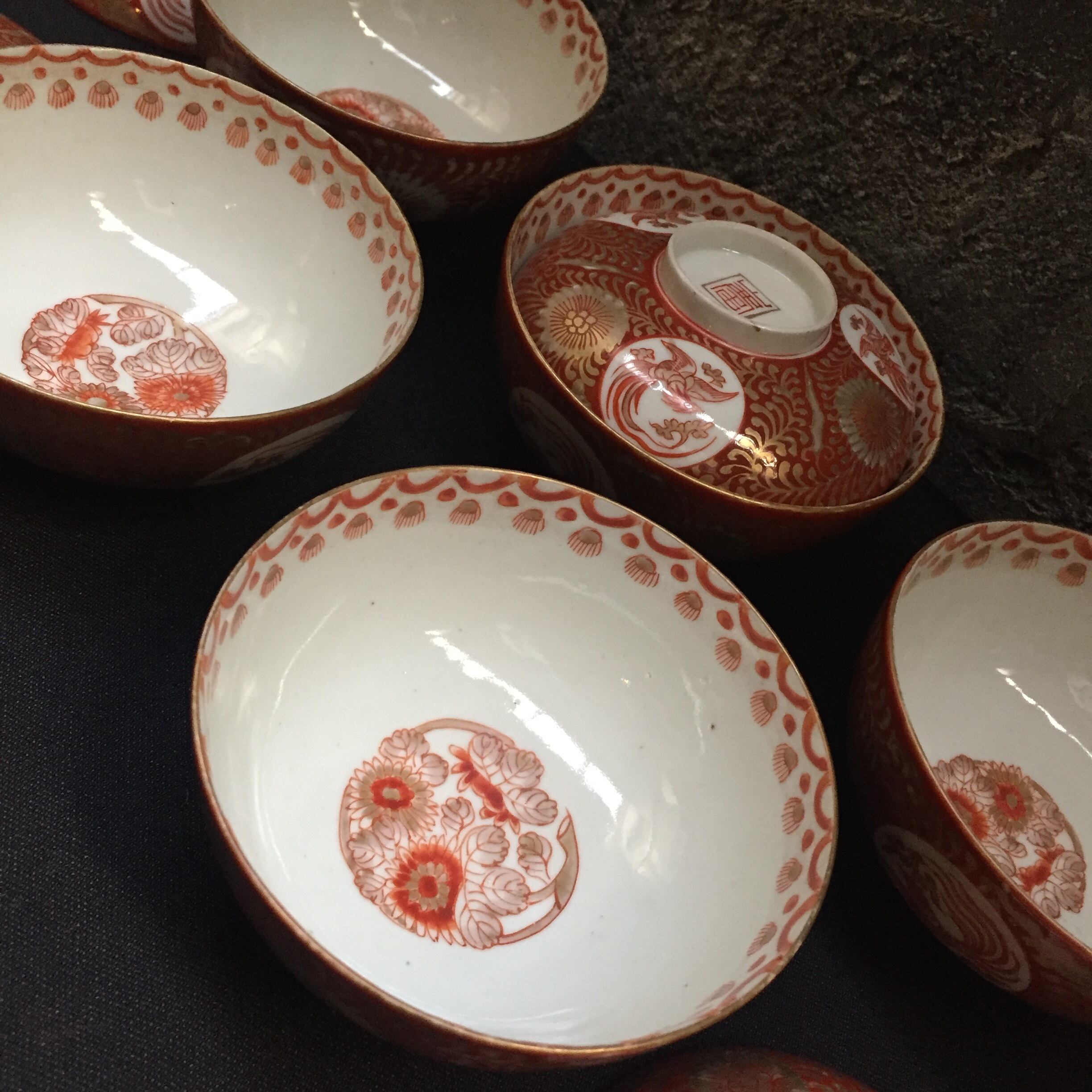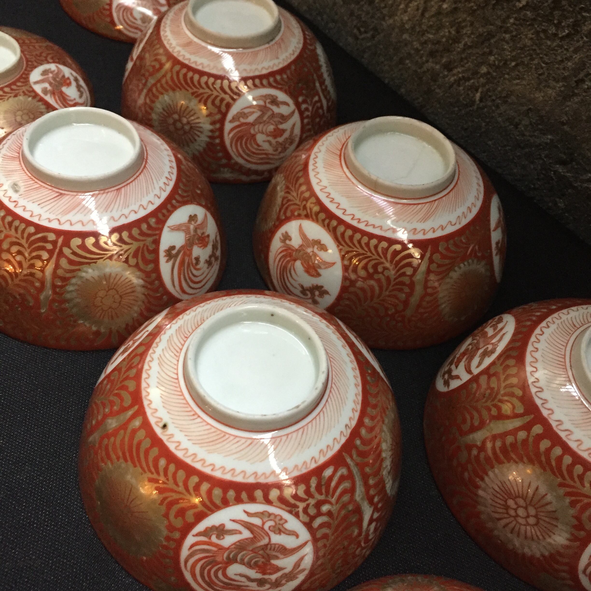 Japan Vintage 明治 古 九谷 赤絵 金彩 金襴手 鳳凰 唐草花鳥 文 茶碗 蓋 在銘 5客