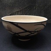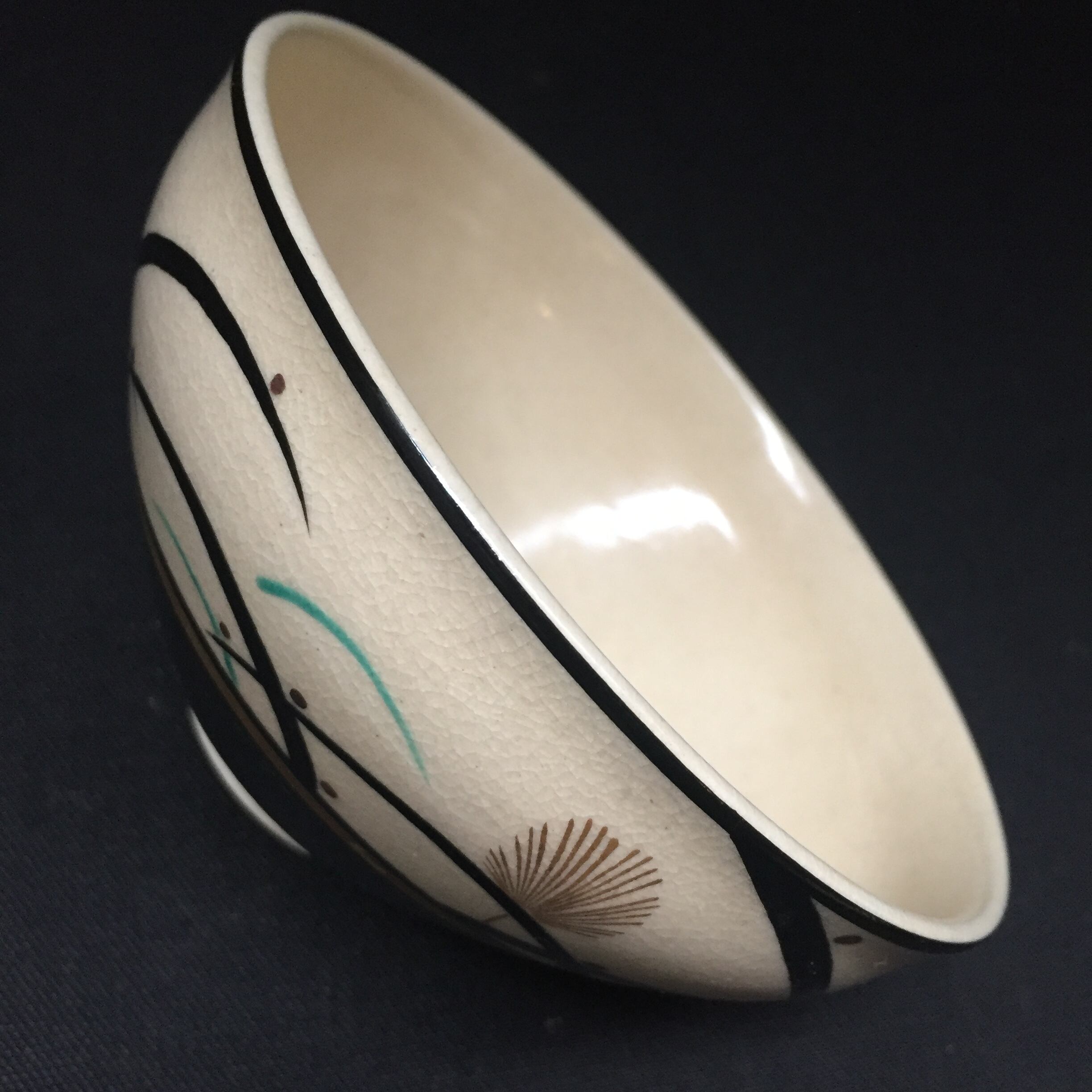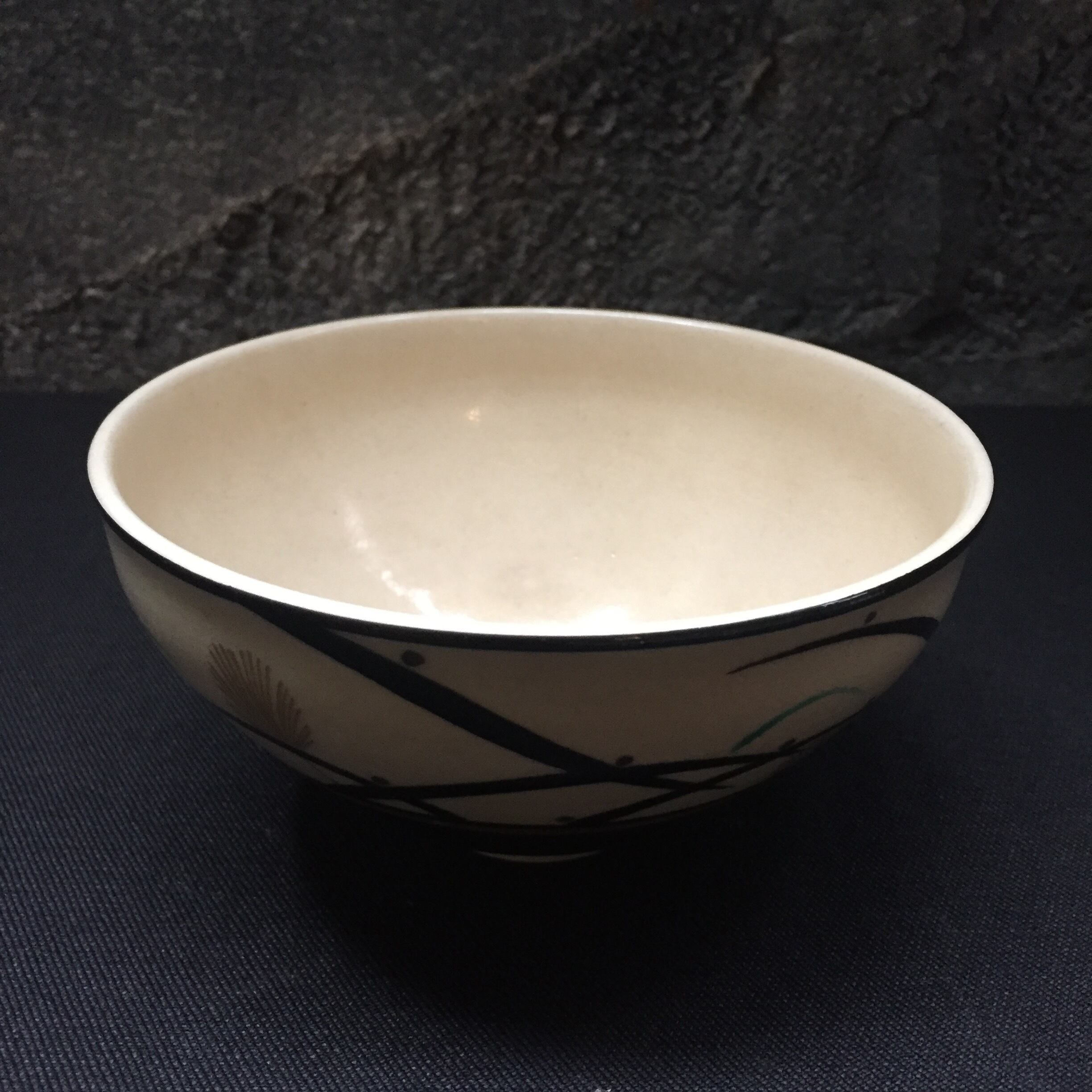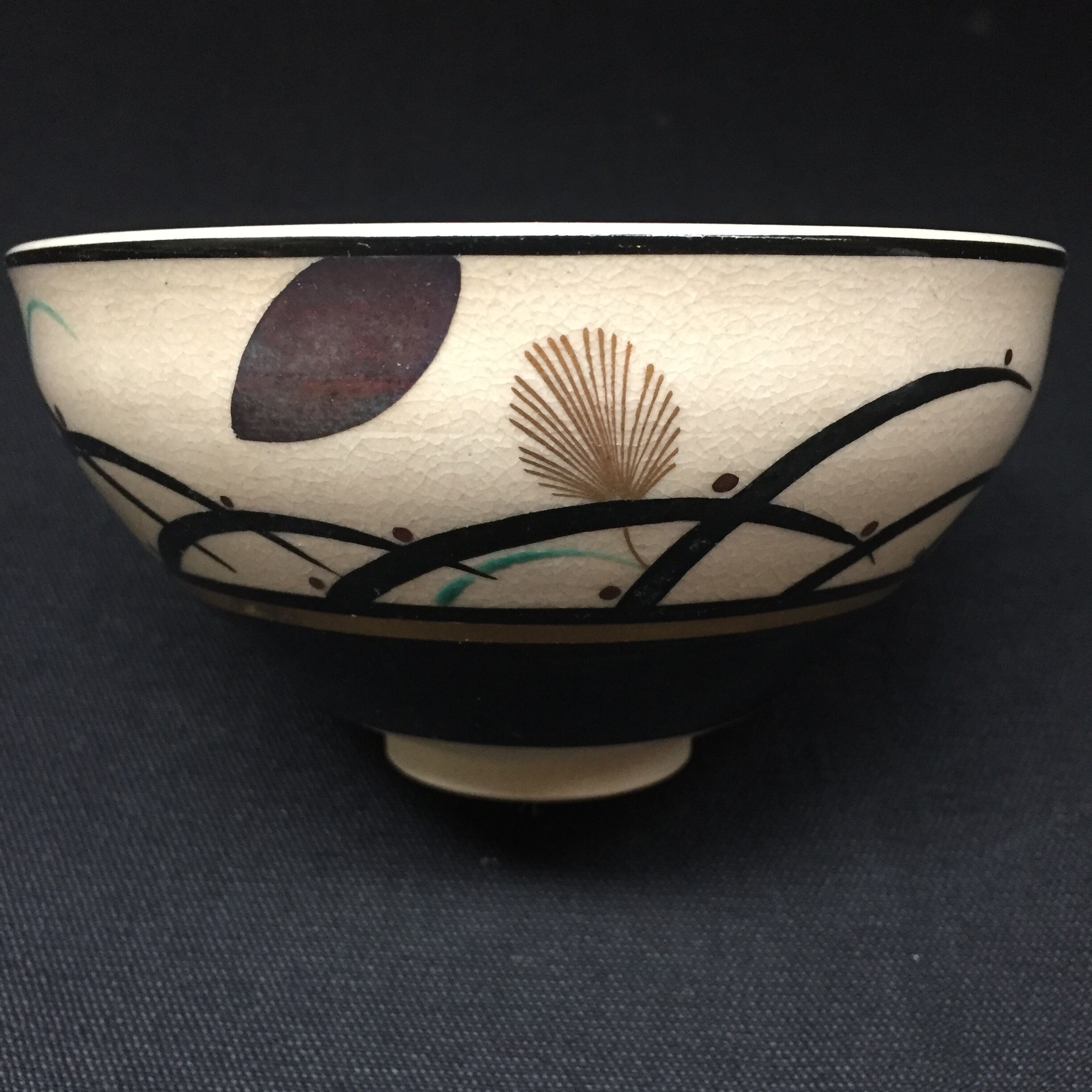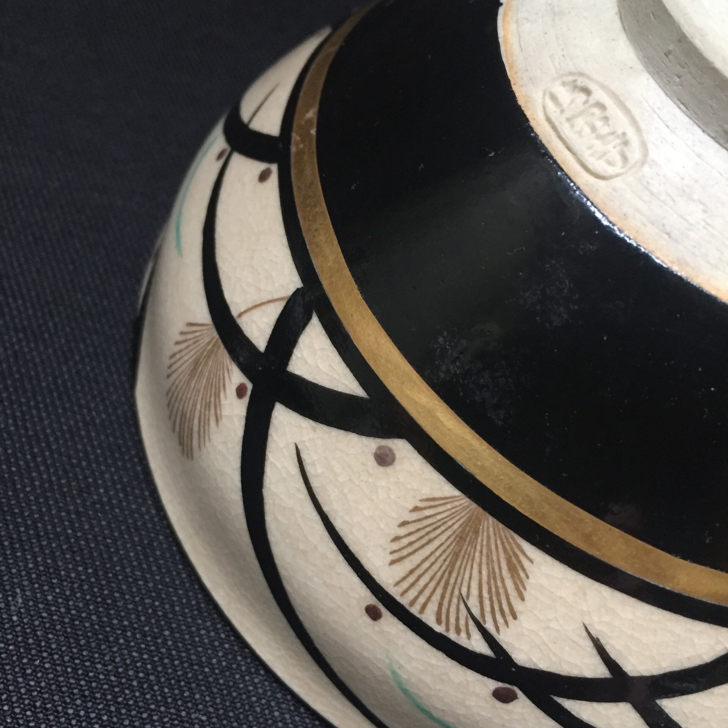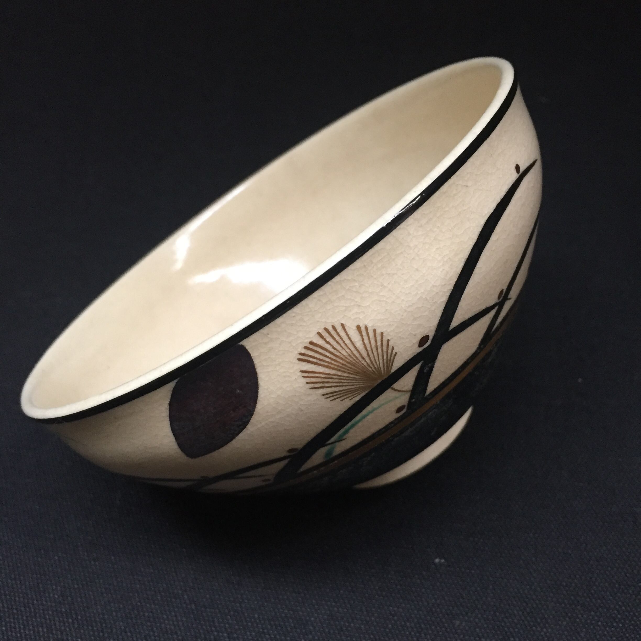金色の水玉と鳥の羽のような文様が愛らしい京焼の抹茶碗。