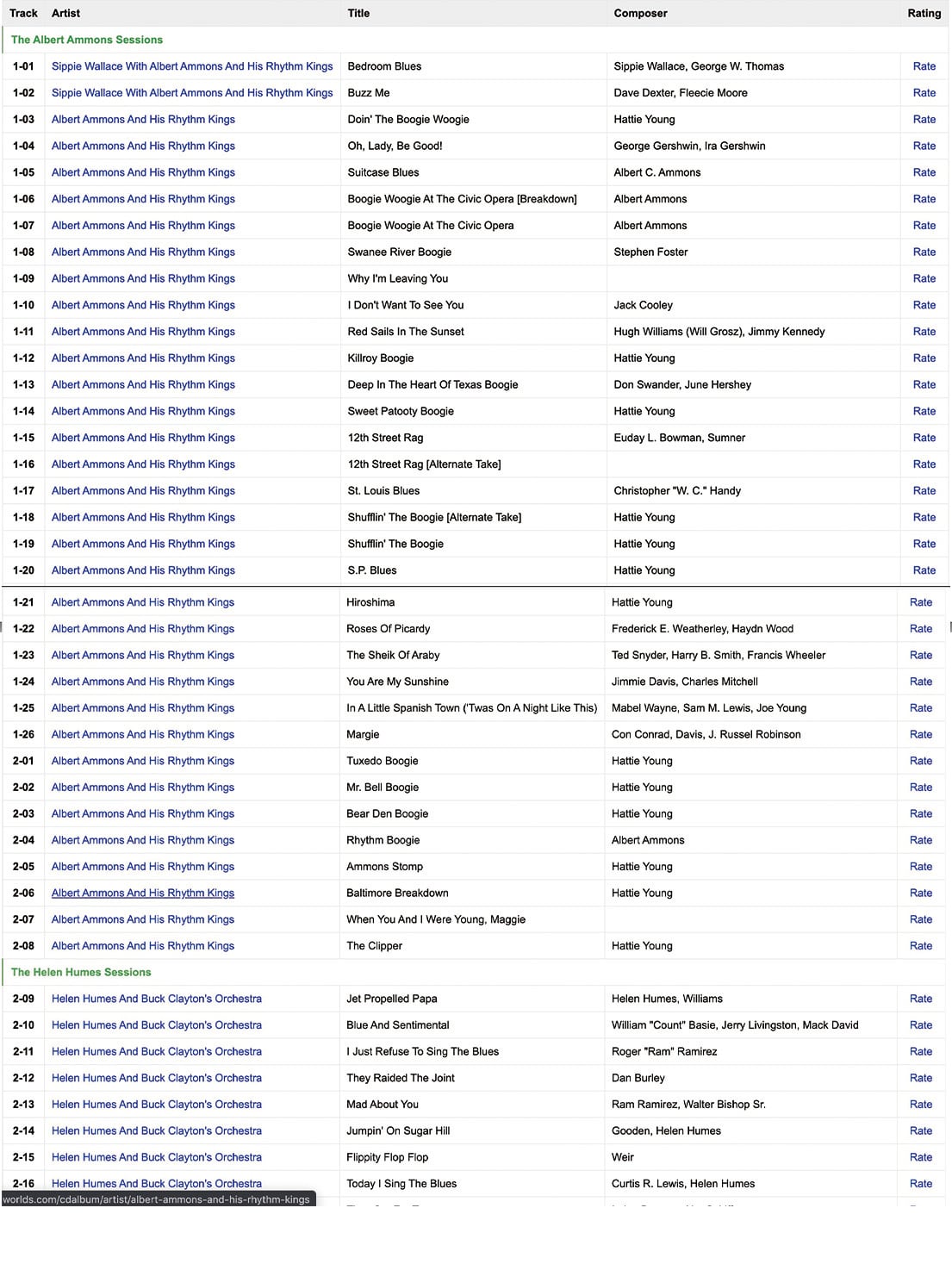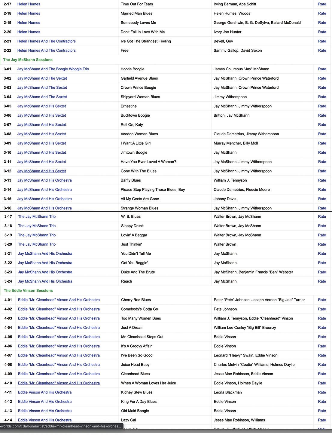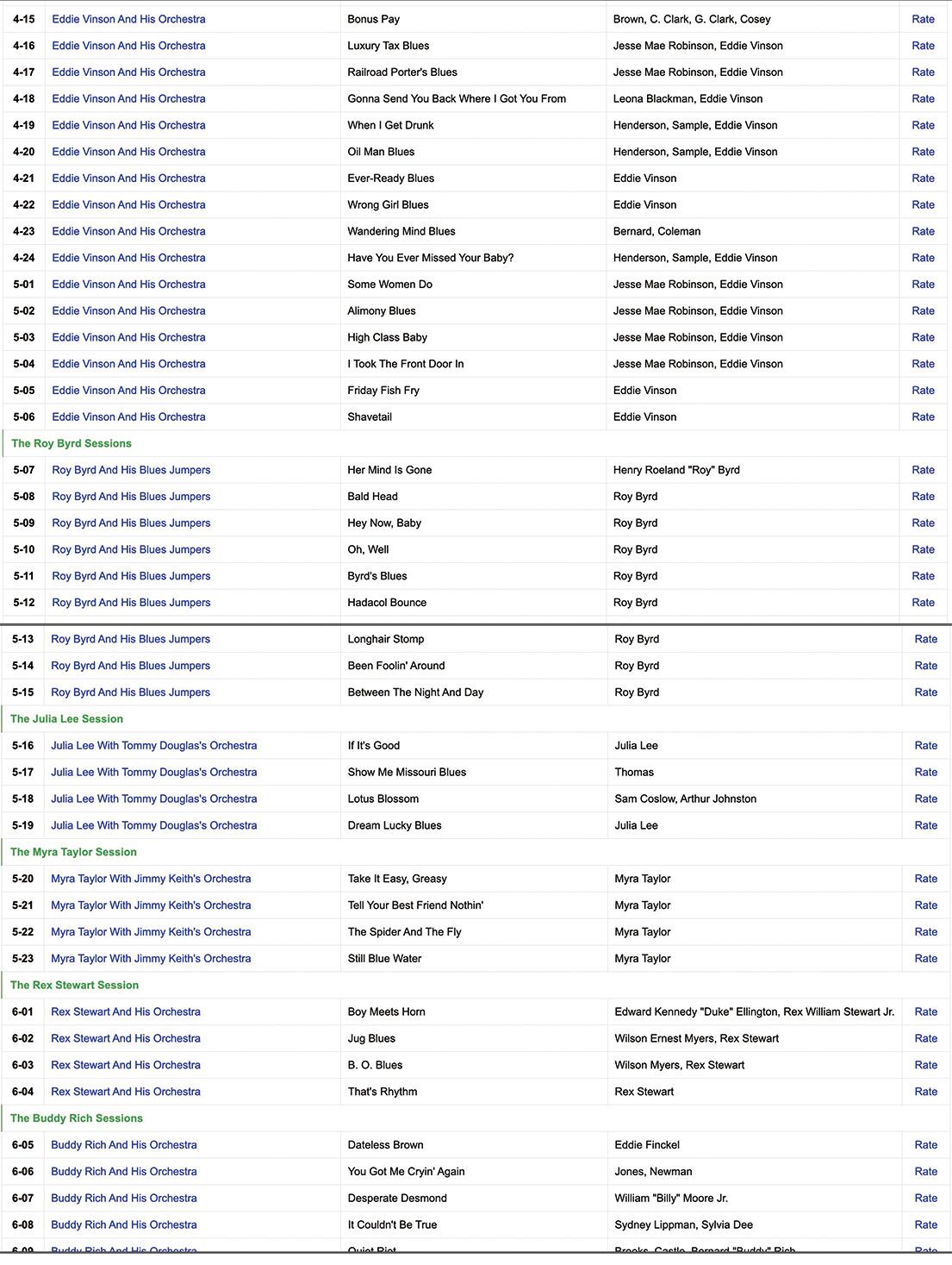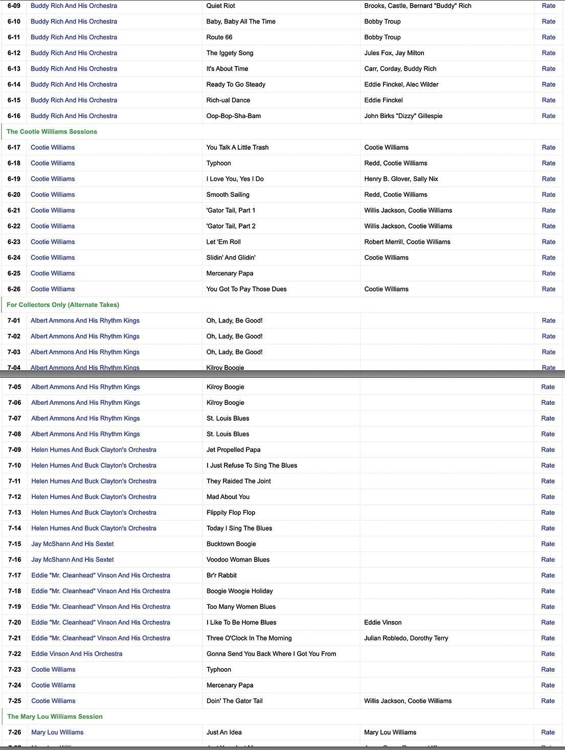 アルバートアンモンズと彼のリズムキングス、ヘレンヒュームズ&バッククレイトンズオーケストラ、ヘレンヒュームズ&ザコントラストツ、ジェイマクシャン&ザブギーウギートリオ/セクステット、エディ "クリーンヘッド"ビンソン&ヒスオーケストラ、ロイバード&彼のブルースジャンパー、トミーダグラスのオーケストラ/ジュリアリー、ジミーキースのオーケストラ/マイラテイラー、レックススチュワート&彼のオーケストラ、バディリッチ&彼のオーケストラ、クーティウィリアムス&彼のオーケストラ。