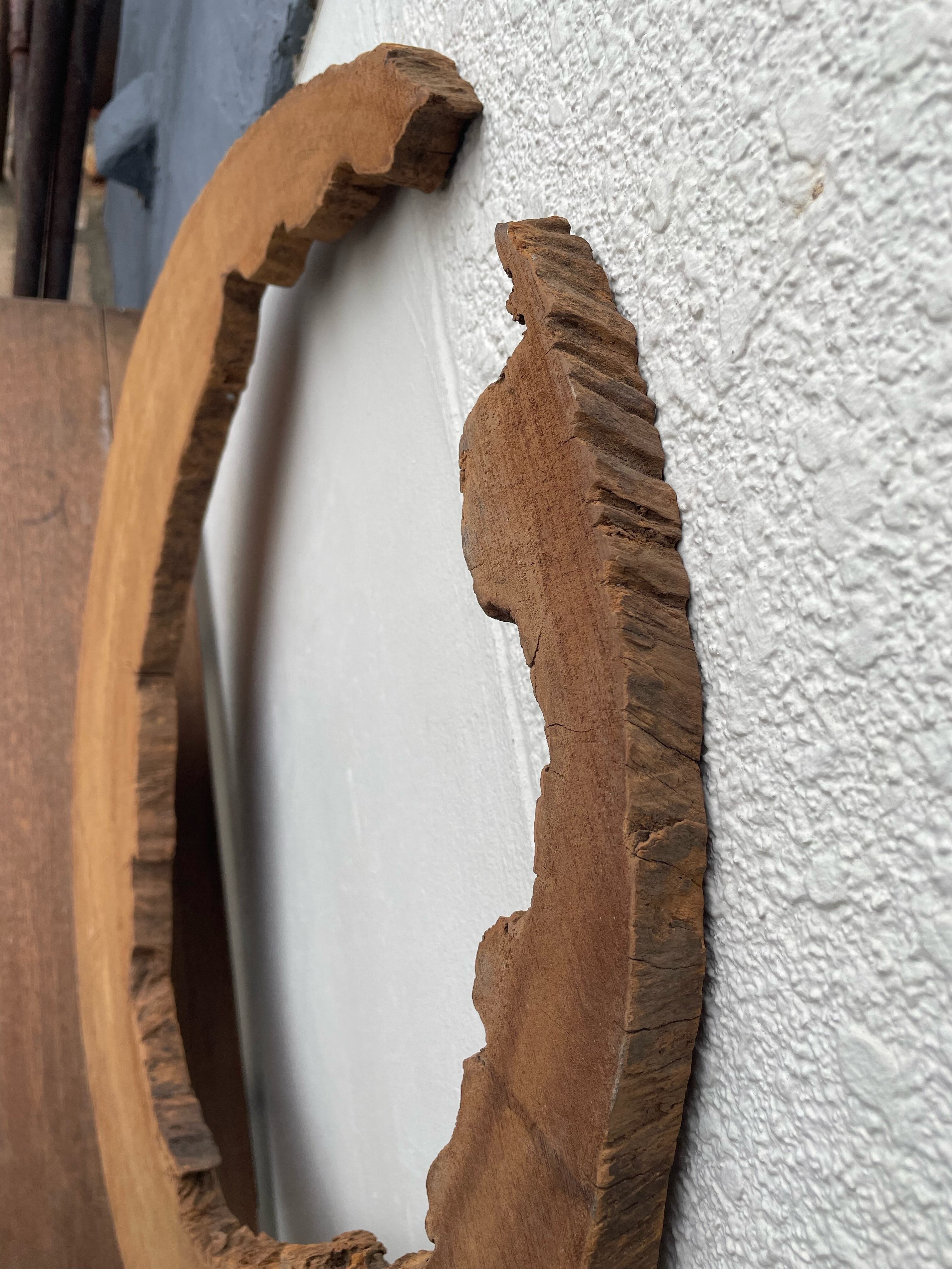 巨大な天然木の切り株をスライス(輪切り)した迫力のあるオブジェ。