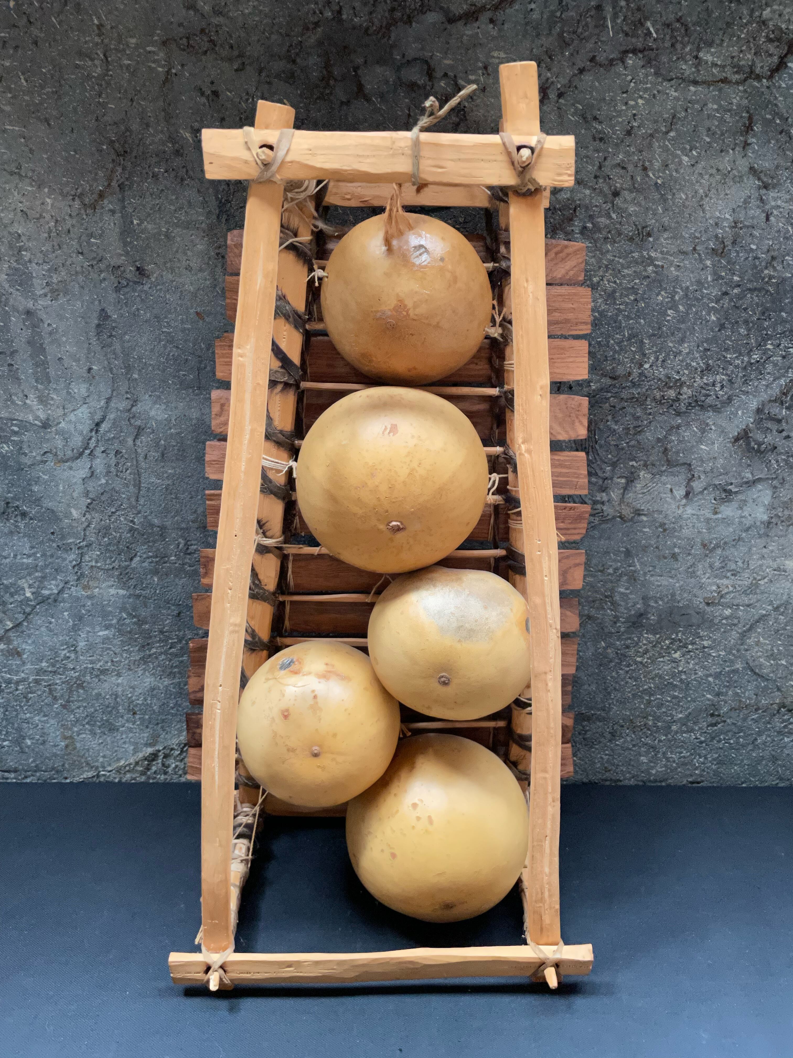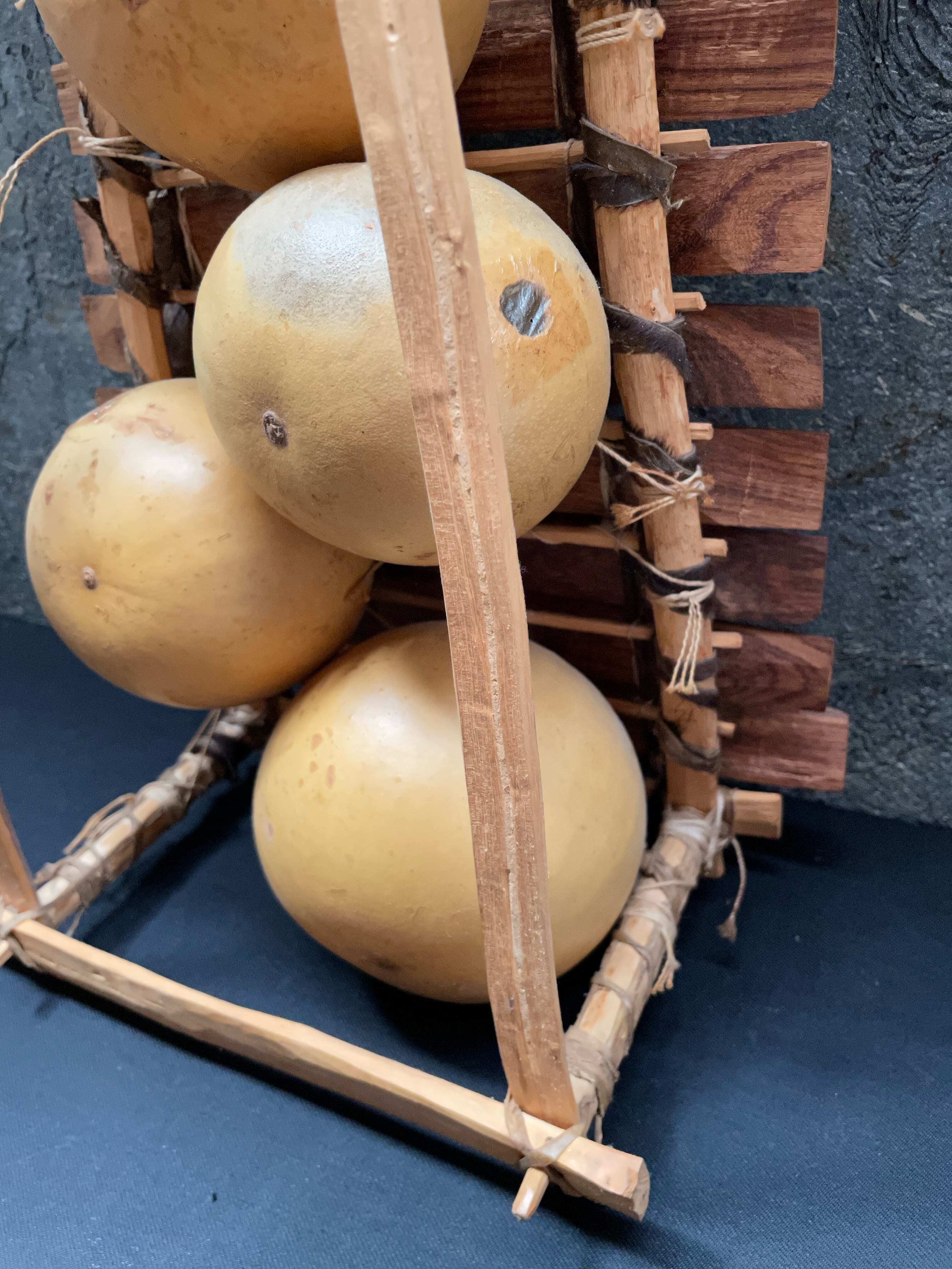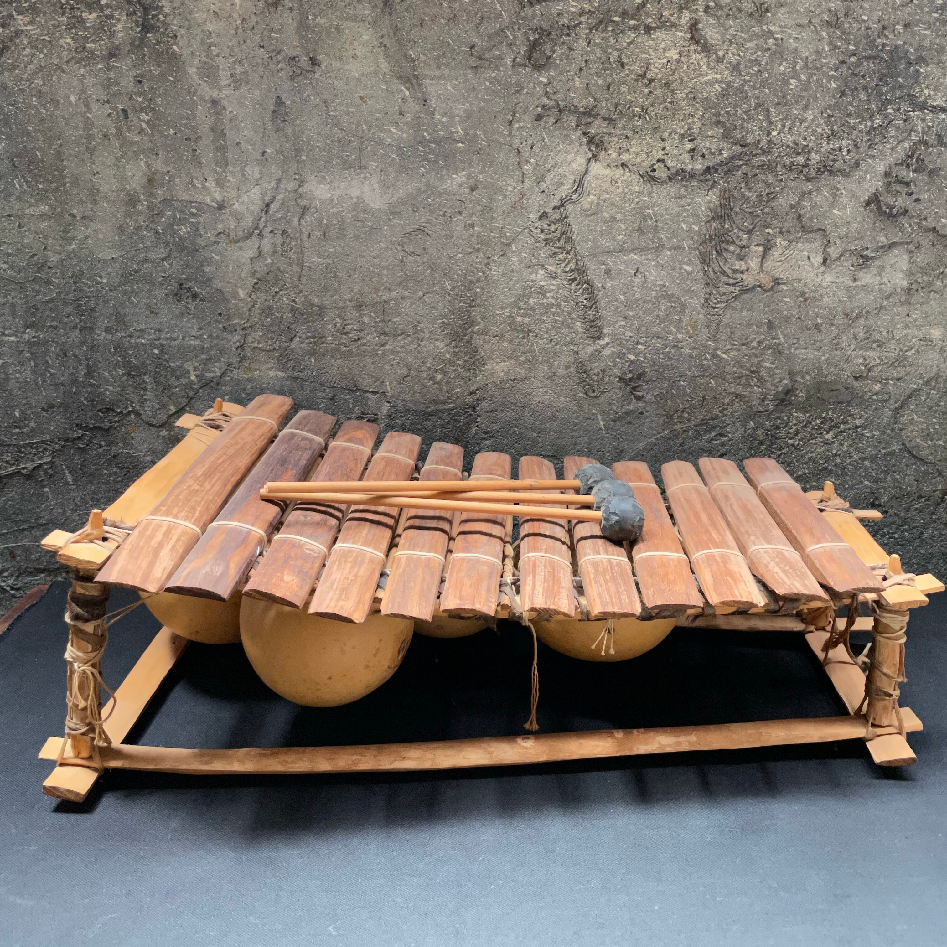 木製の鍵盤の下に大きさの異なる複数のひょうたんを取り付け
