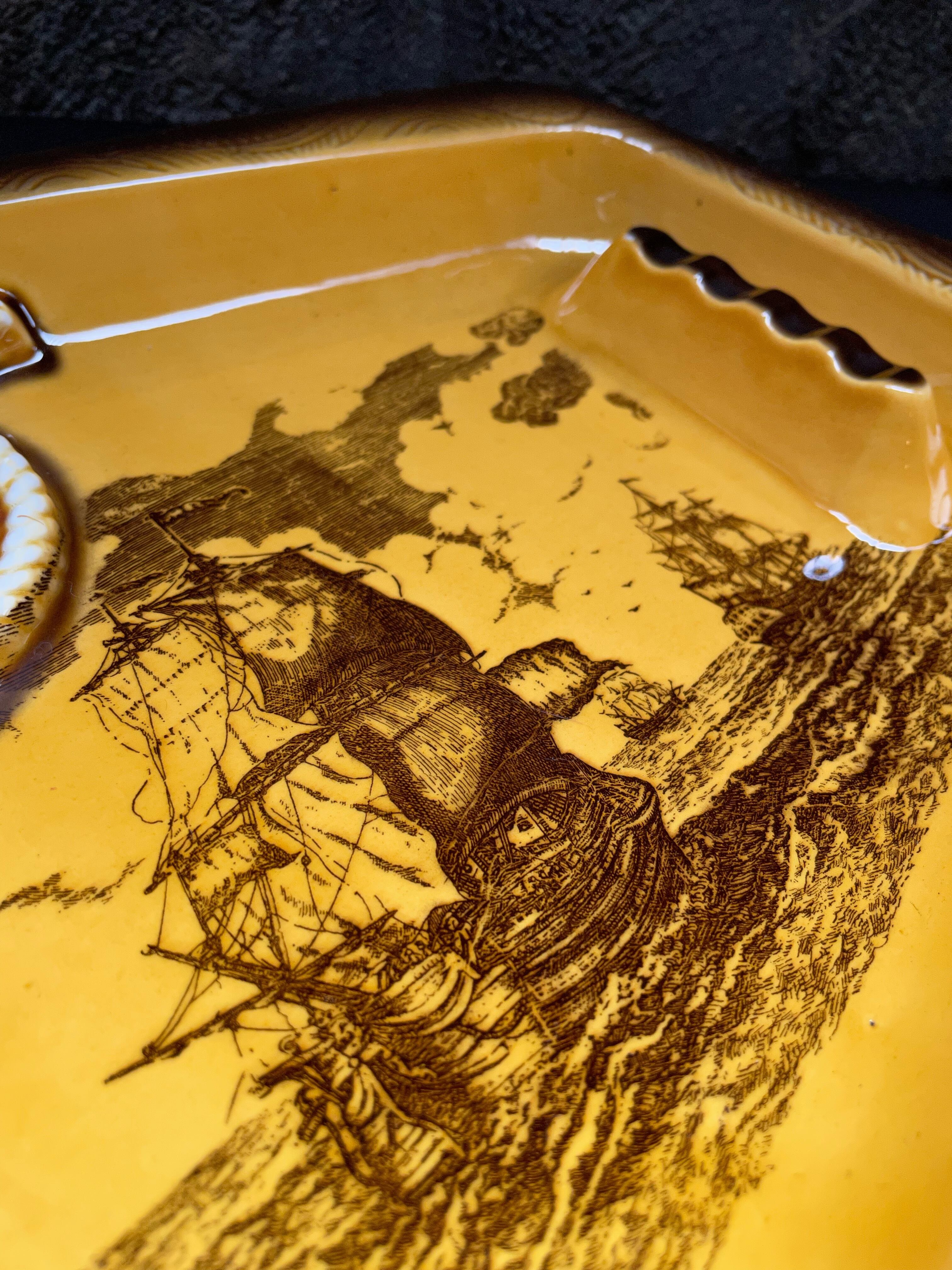 大海原を駆ける三艘の帆船が描かれ、