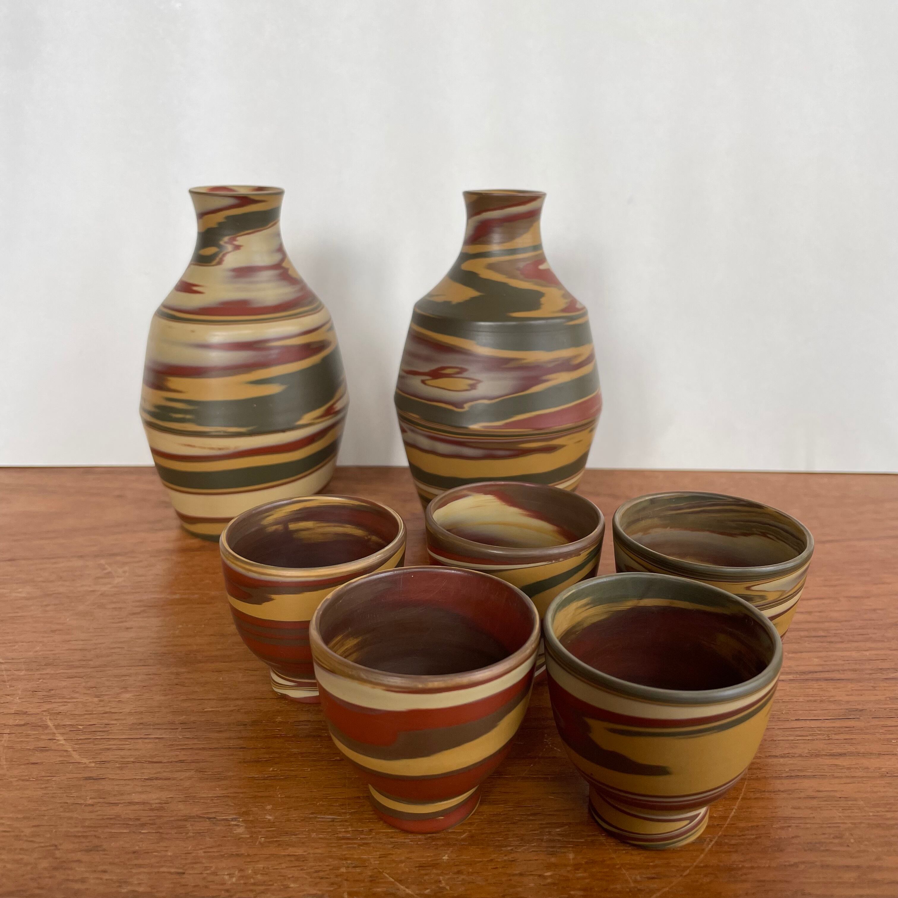 Japan Vintage 常滑名工 小西友仙 徳利一対 盃 5客 酒器 練り込み 練込 孔雀手 マーブル