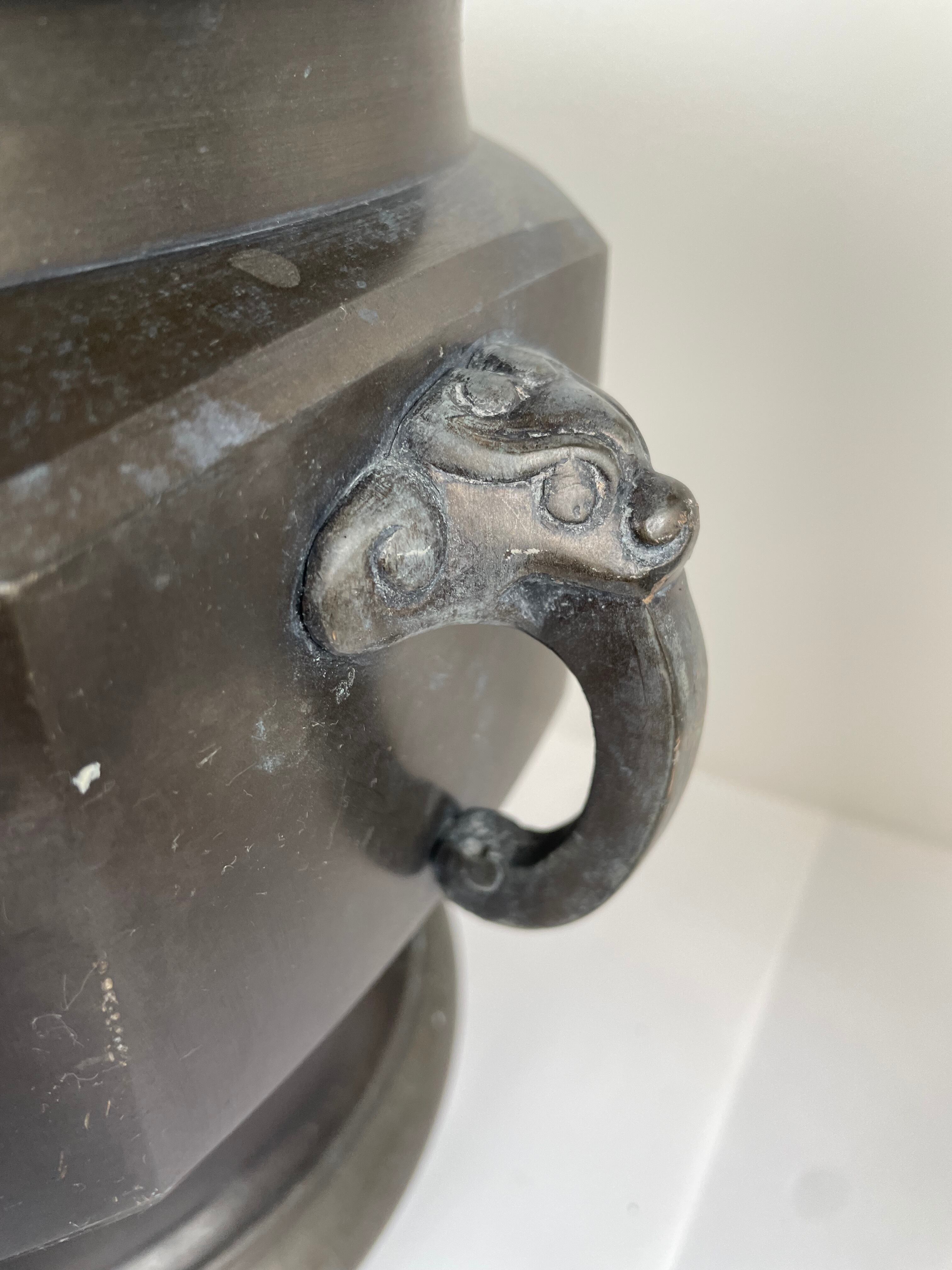 両サイドに耳(ハンドル、取手、持ち手)がついており、獣(獅子、龍、牛)を模したレリーフ(彫り模様)が施されています。