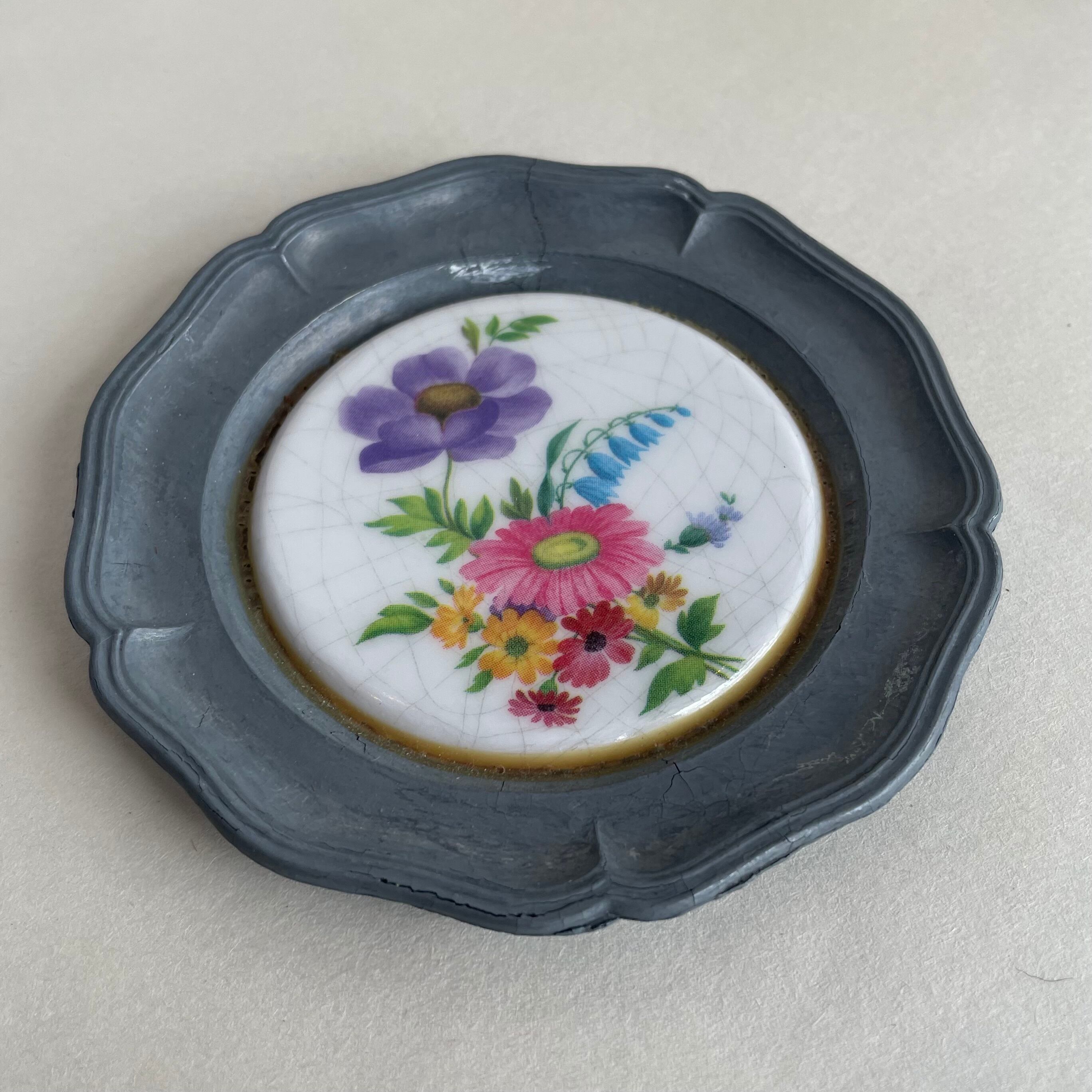 花が描かれた陶器皿の周囲をピューター(錫)で囲った愛らしい一品。