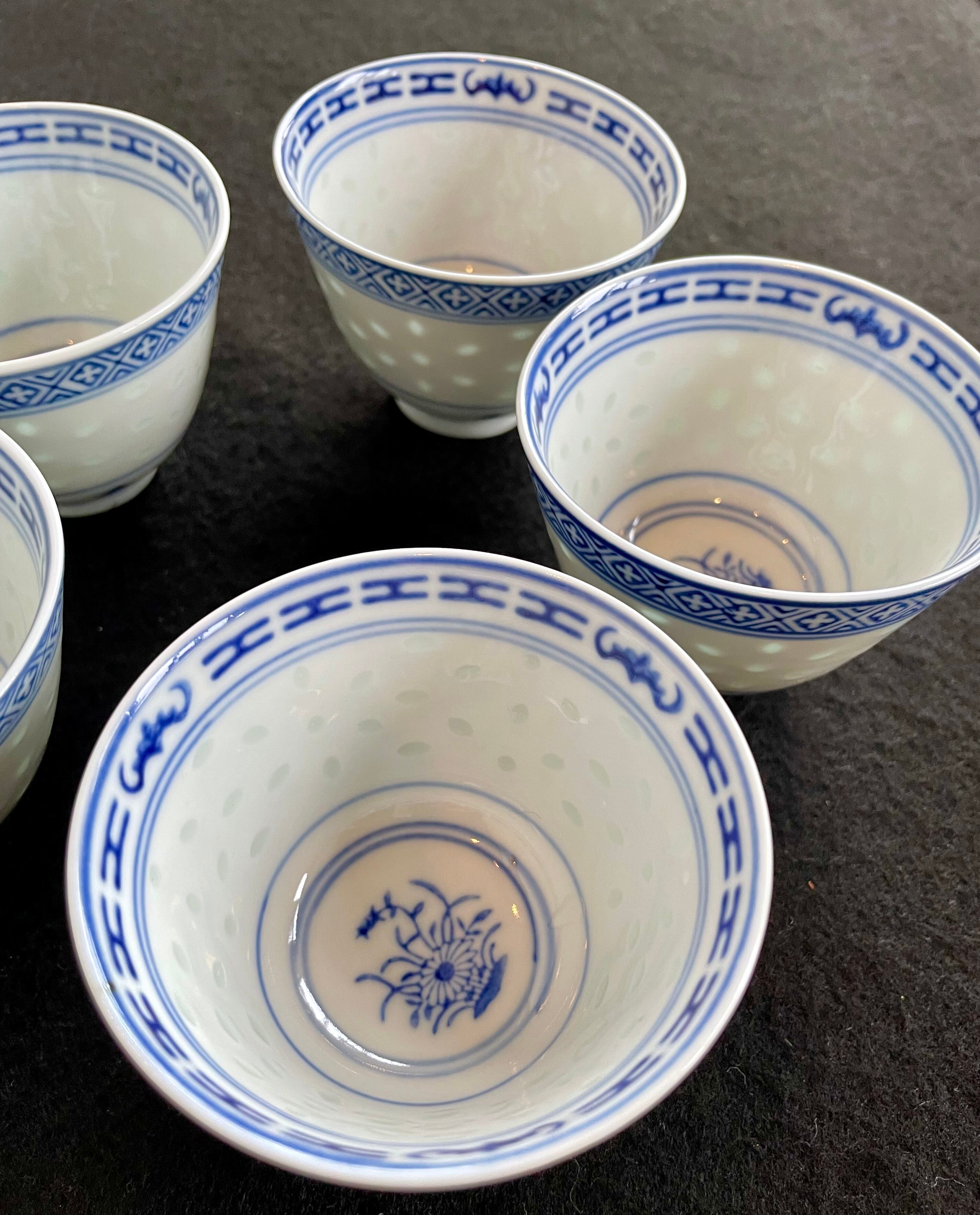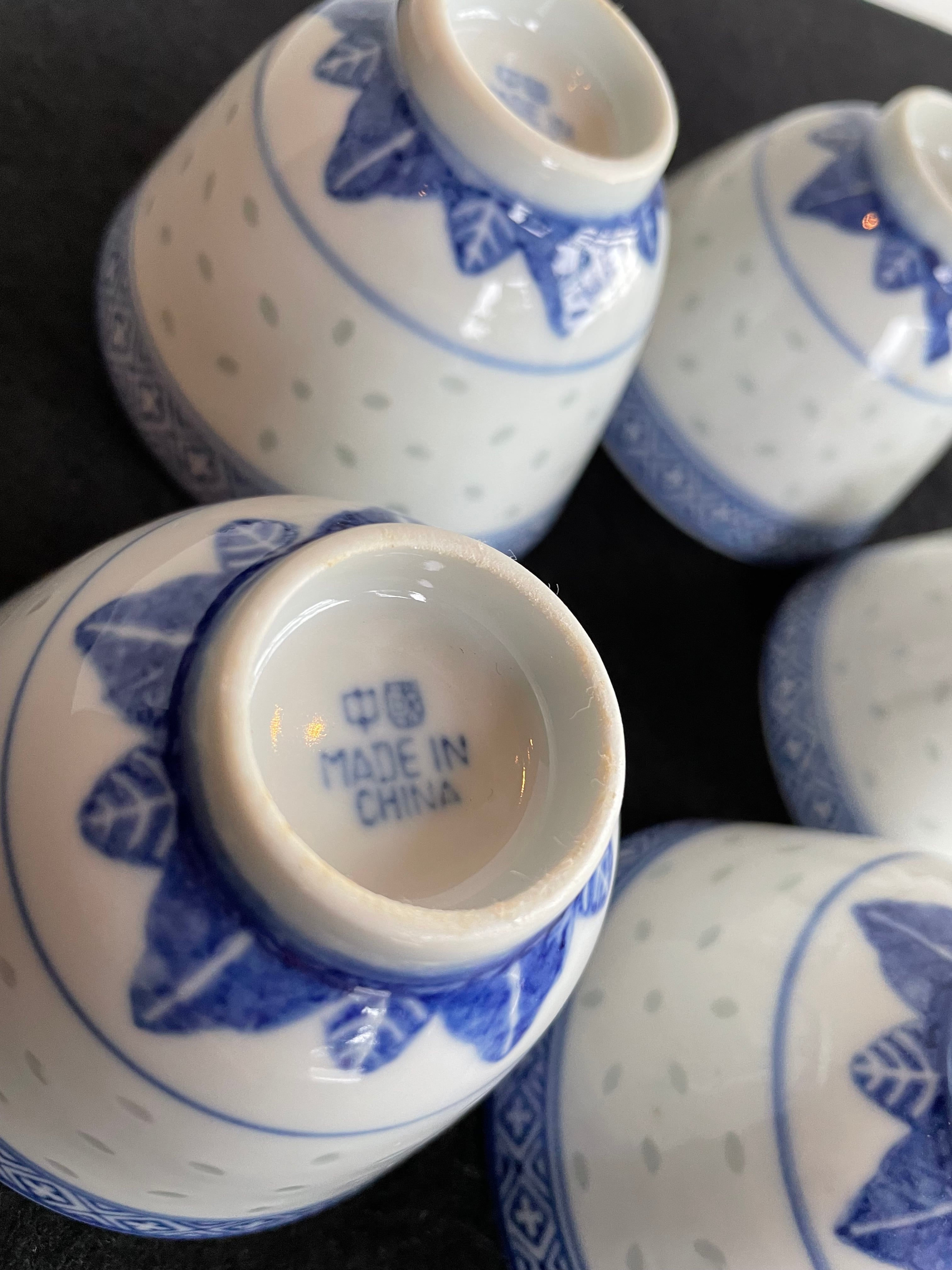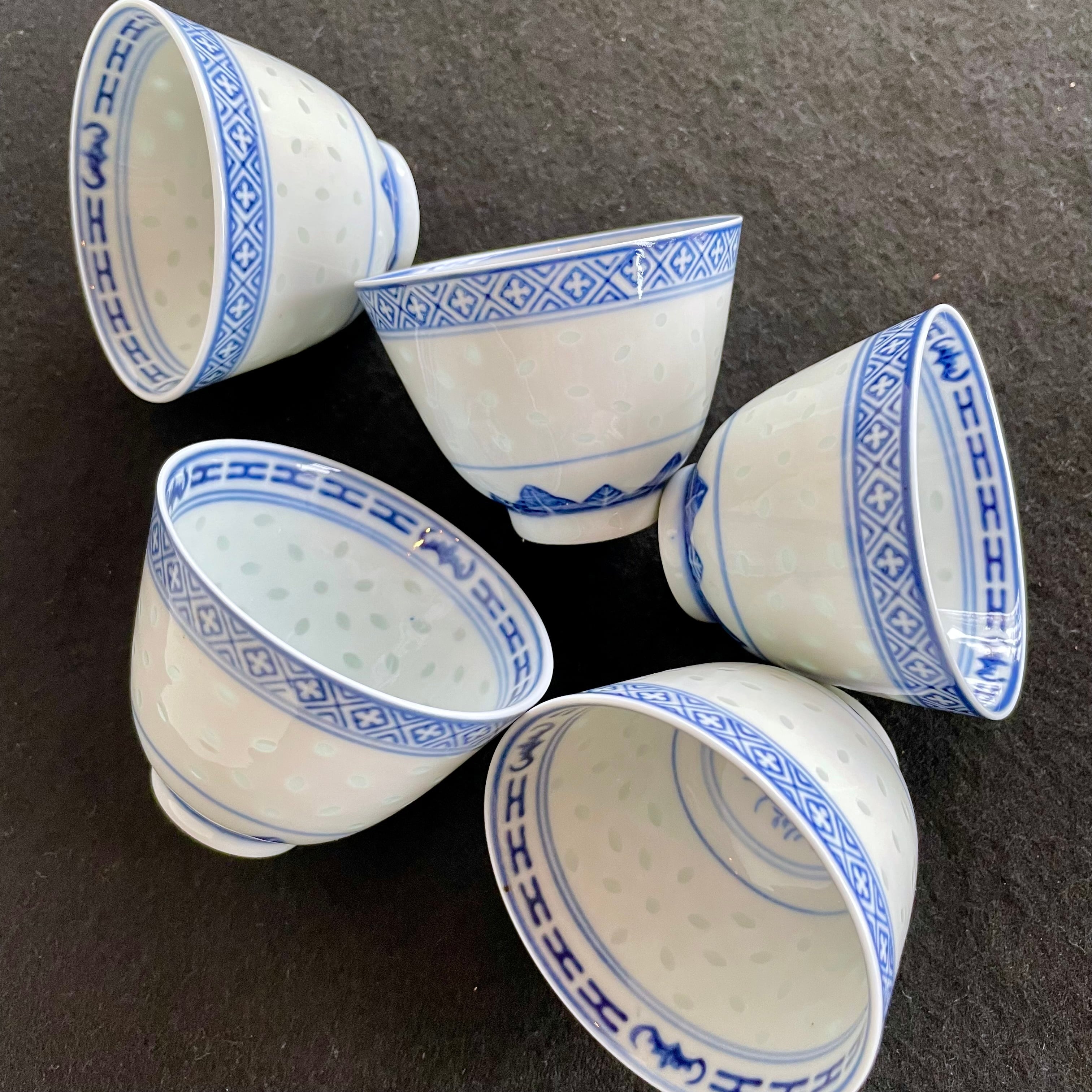 China Vintage 景徳鎮 中国 茶器 青花 玲瓏 湯呑 5客揃 ホタル 蛍焼 透かし 湯呑 美品