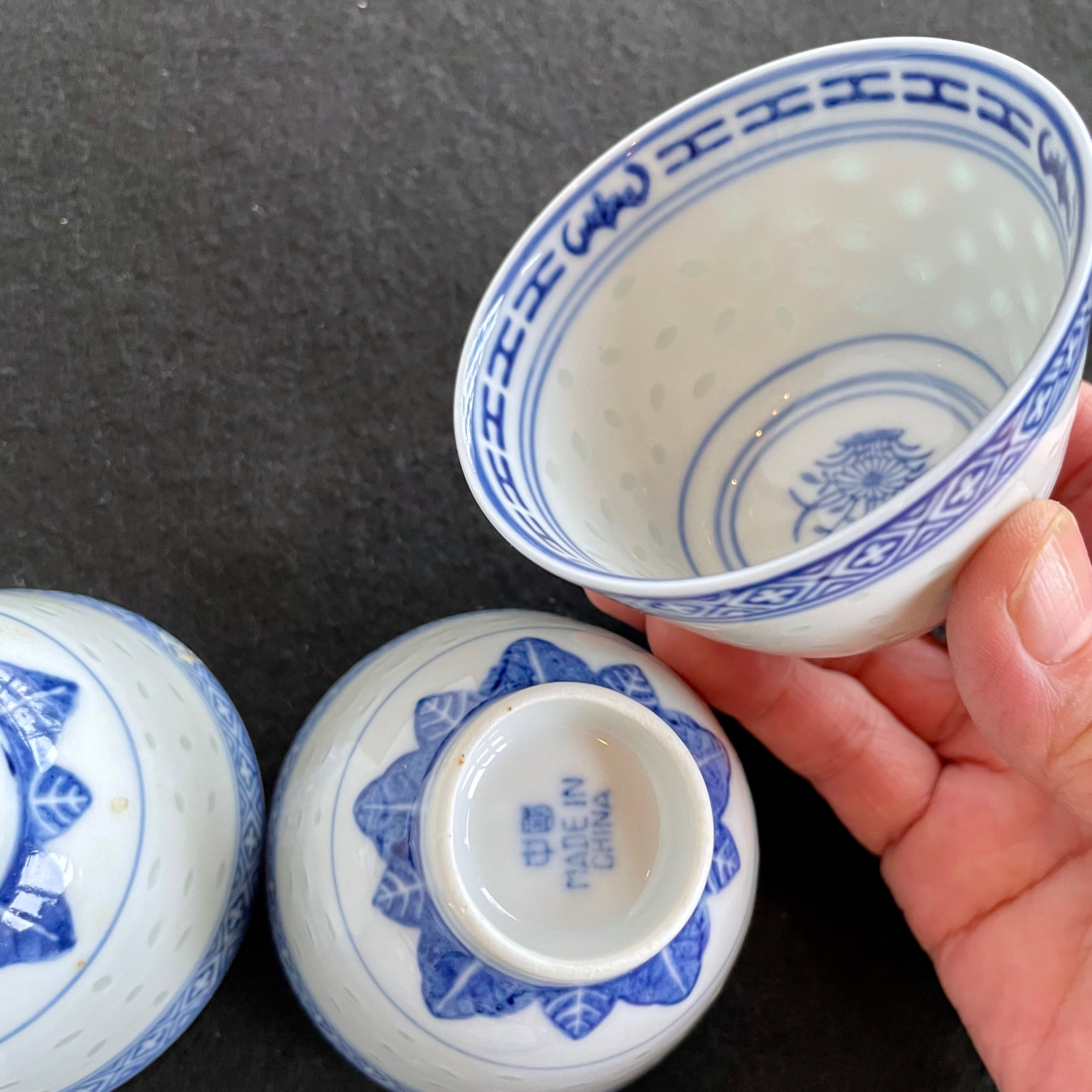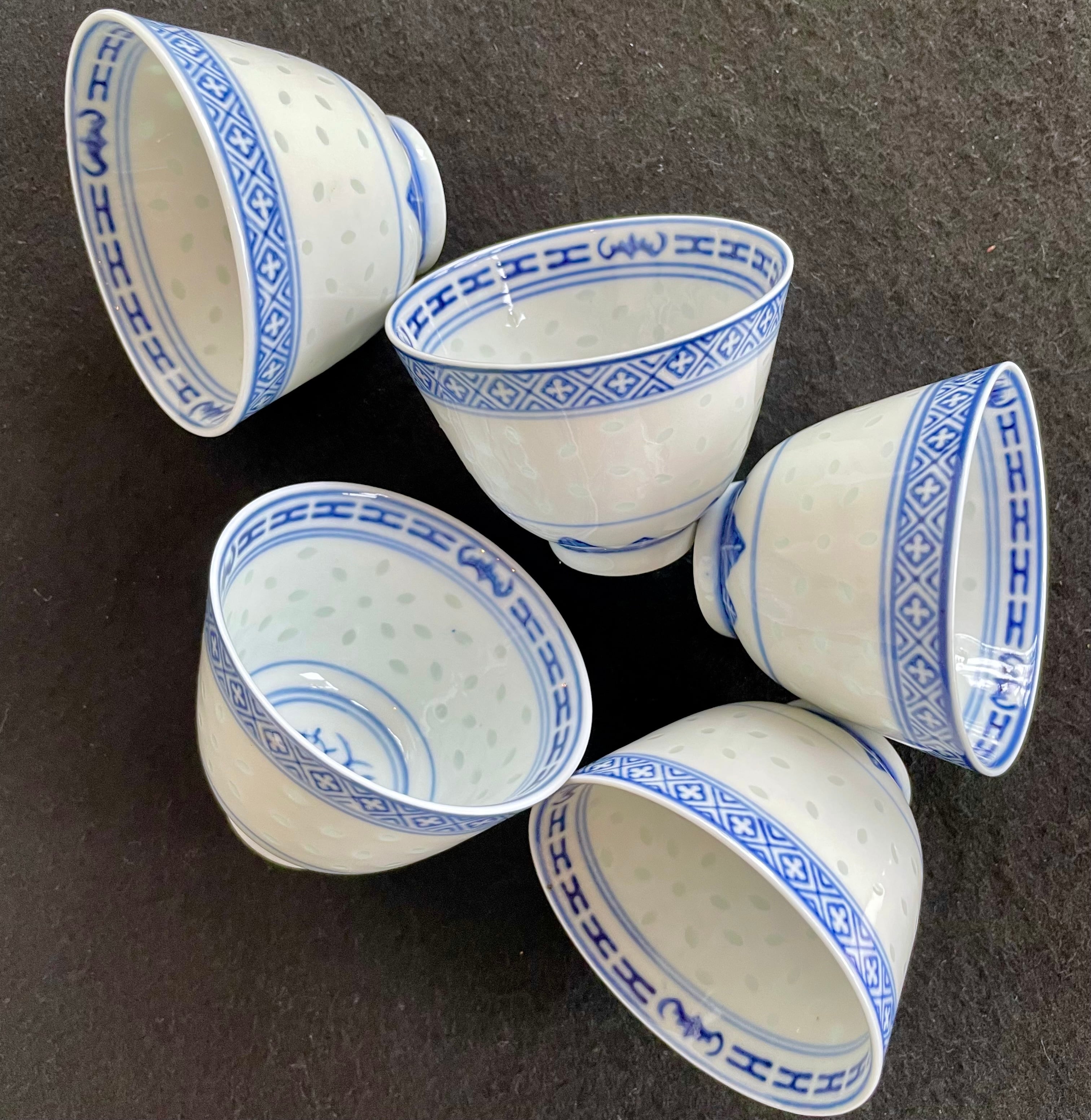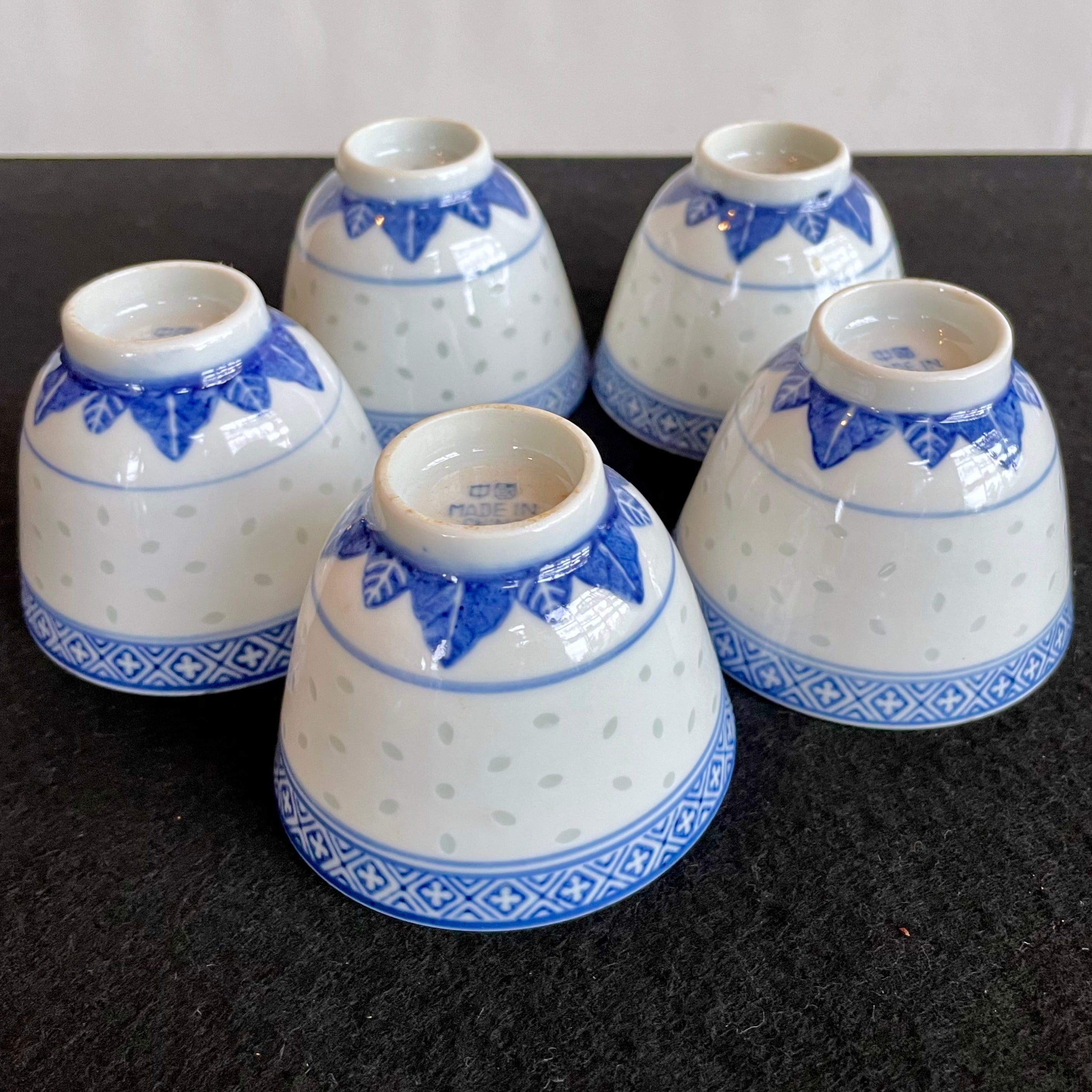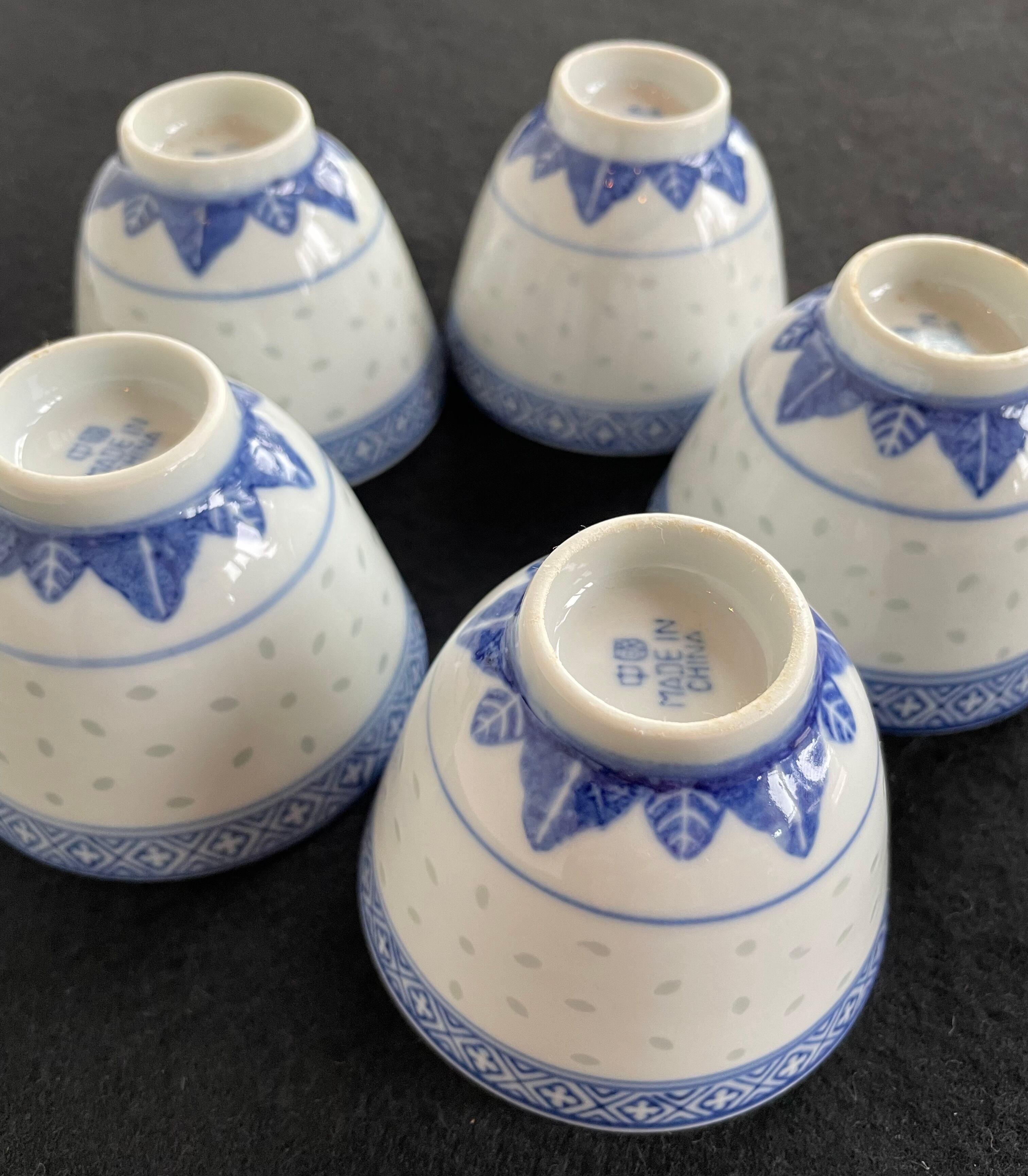 China Vintage 景徳鎮 中国 茶器 青花 玲瓏 湯呑 5客揃 ホタル 蛍焼 透かし 湯呑 美品