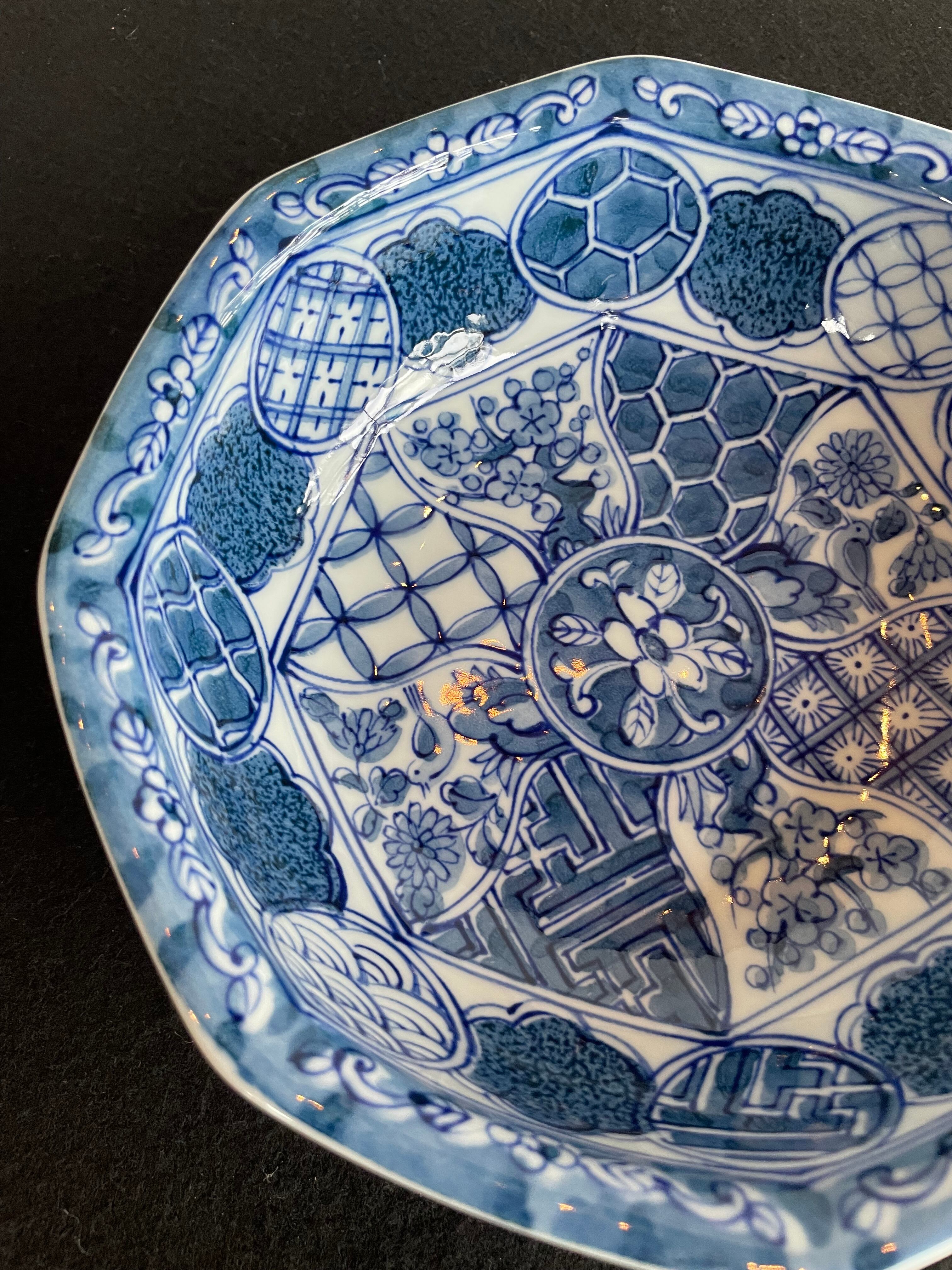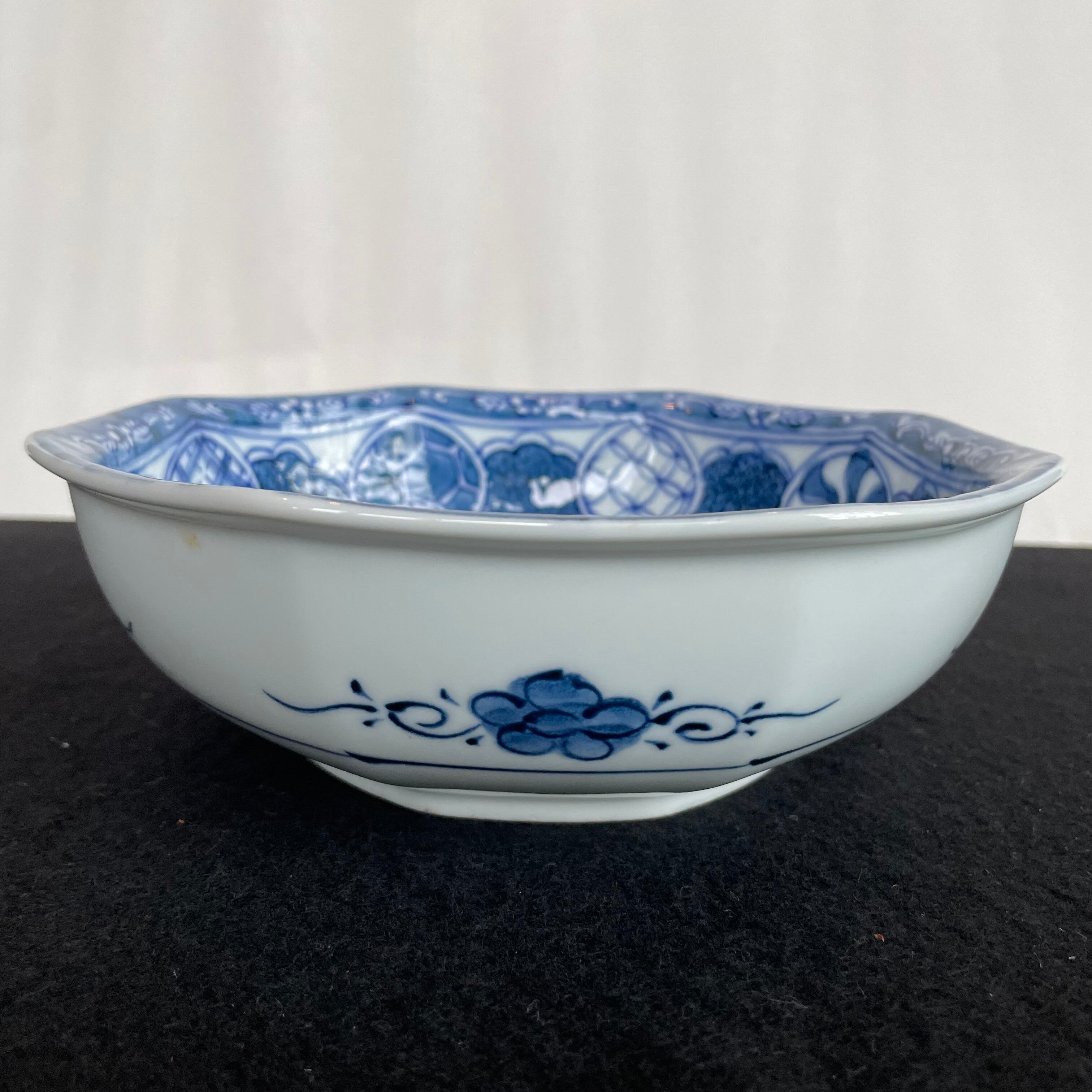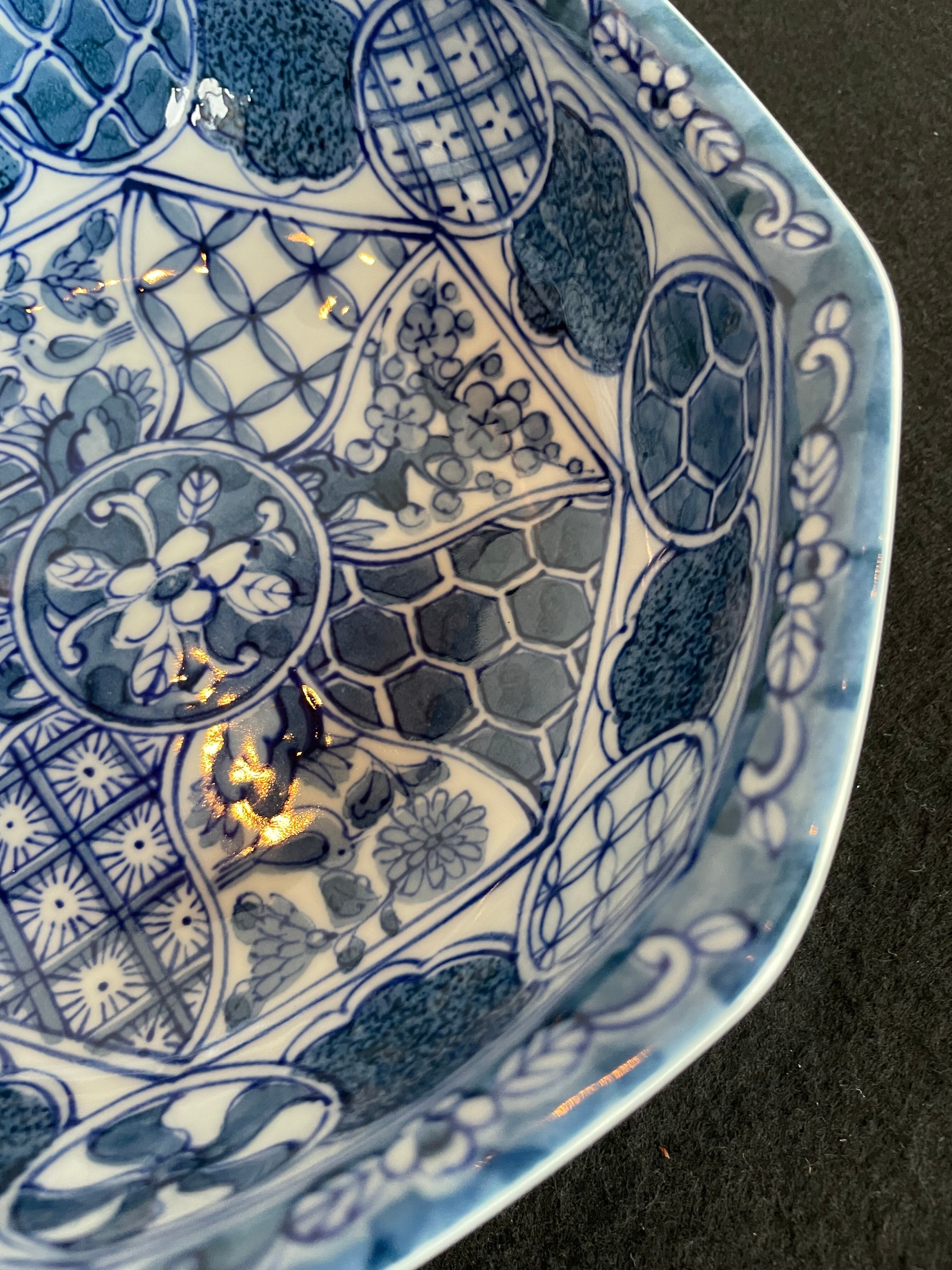 Japan Vintage 有田焼 義峰窯 八角 大鉢 祥瑞 染付 菓子鉢 ねじり 祥瑞 梅菊鳥文 美品