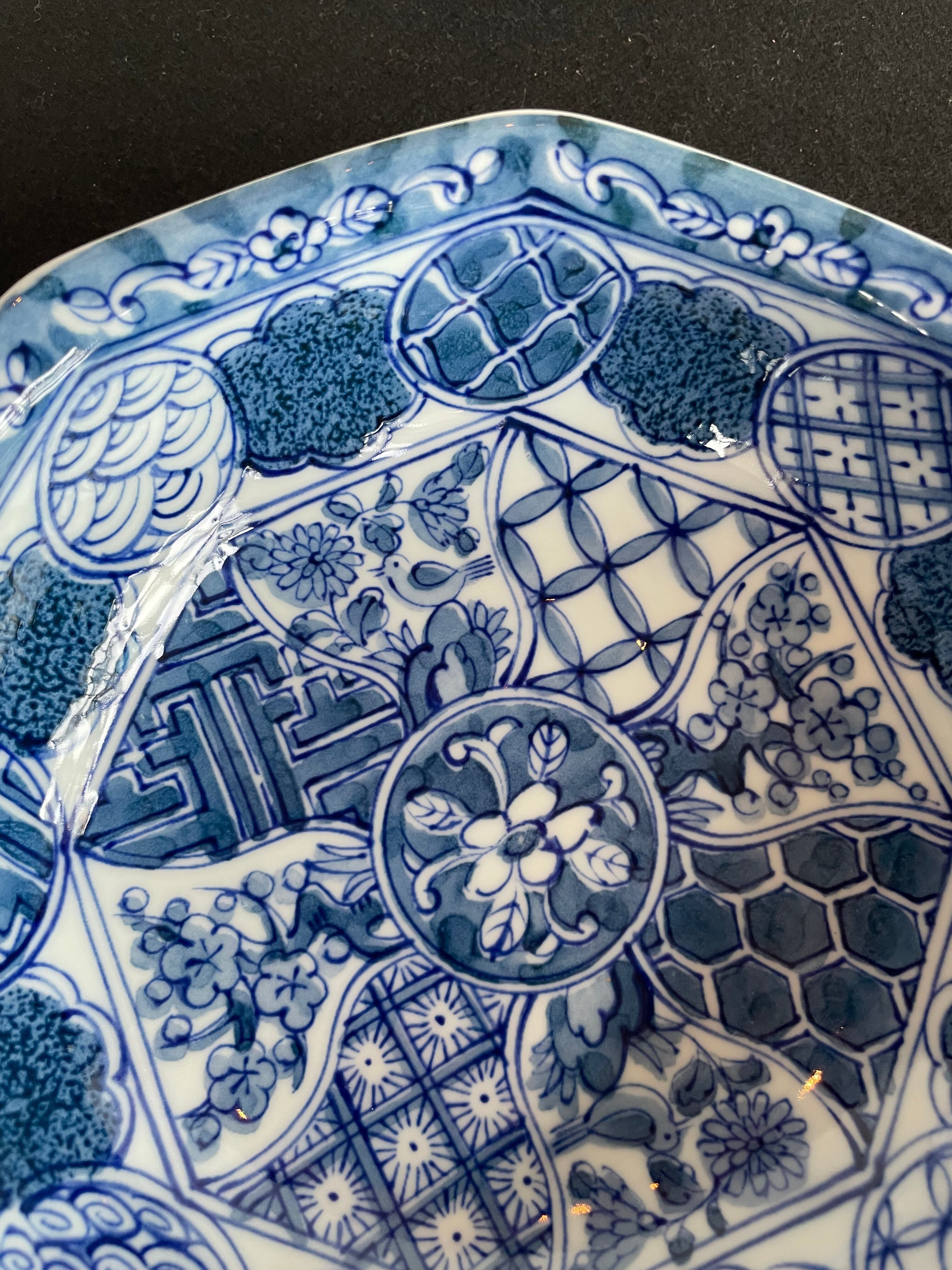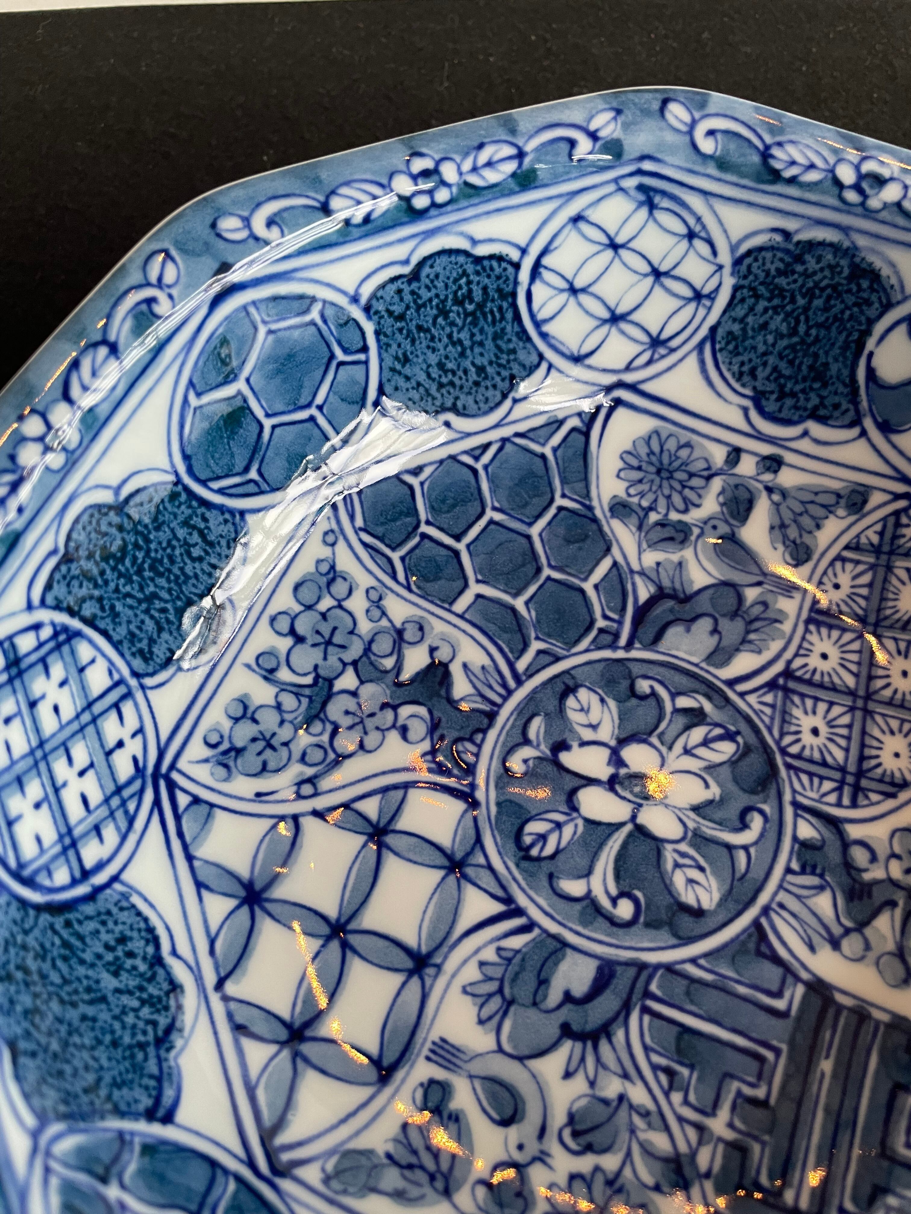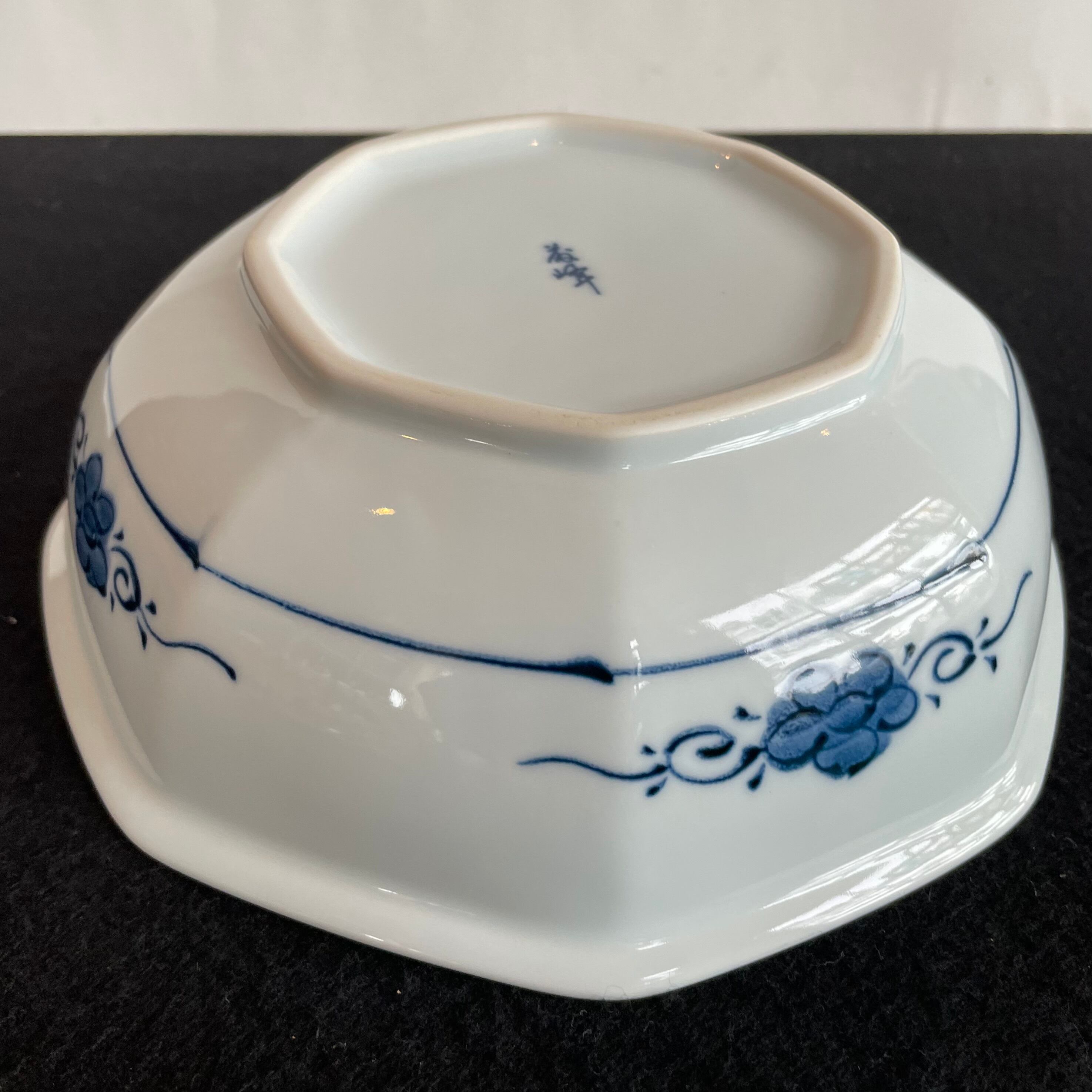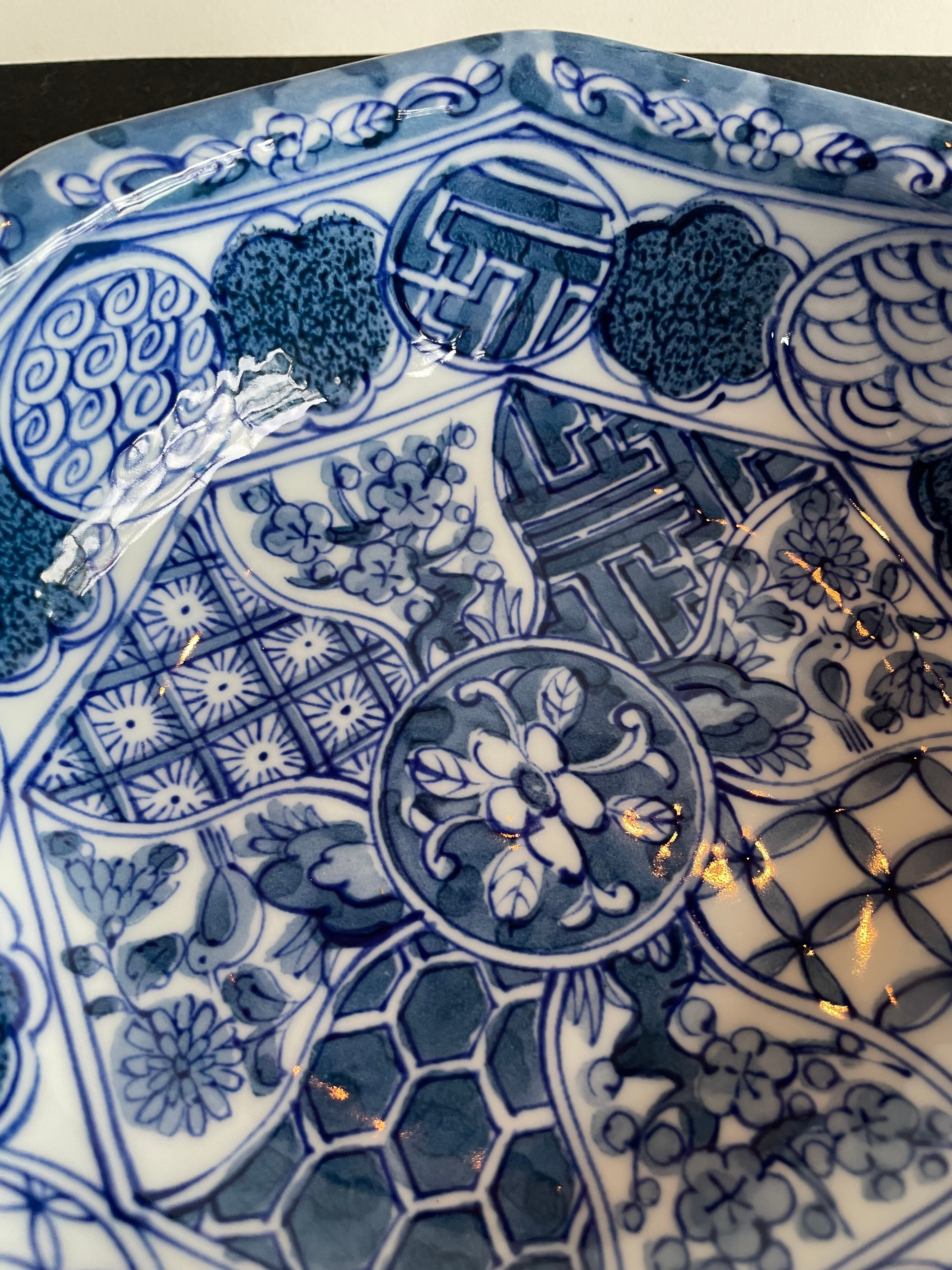 Japan Vintage 有田焼 義峰窯 八角 大鉢 祥瑞 染付 菓子鉢 ねじり 祥瑞 梅菊鳥文 美品