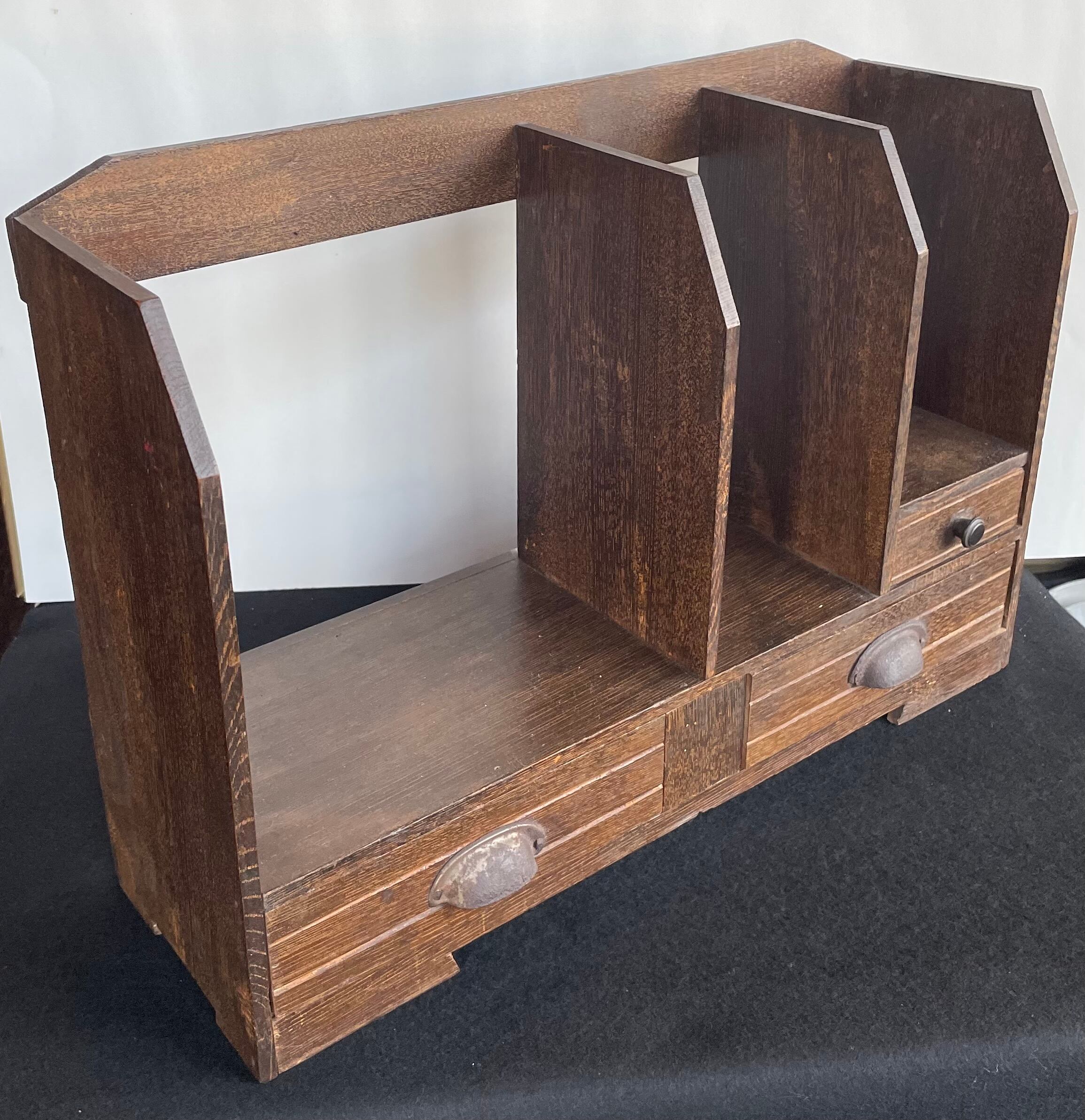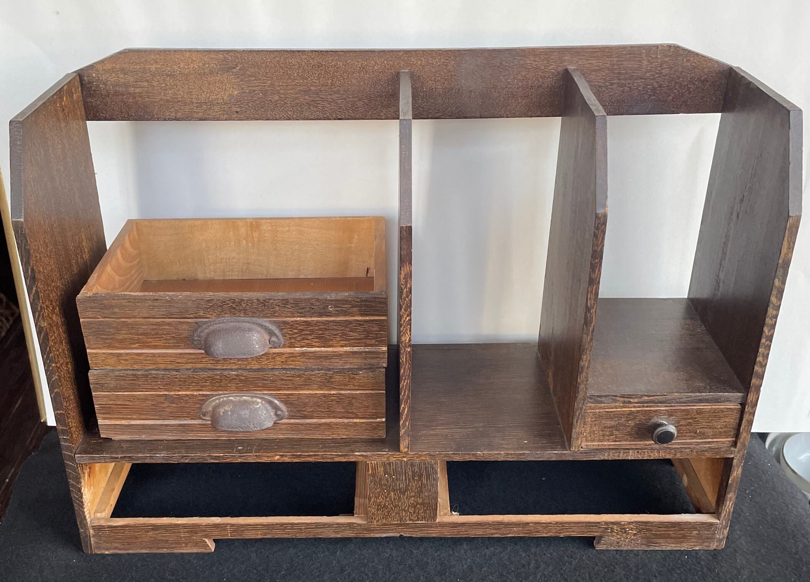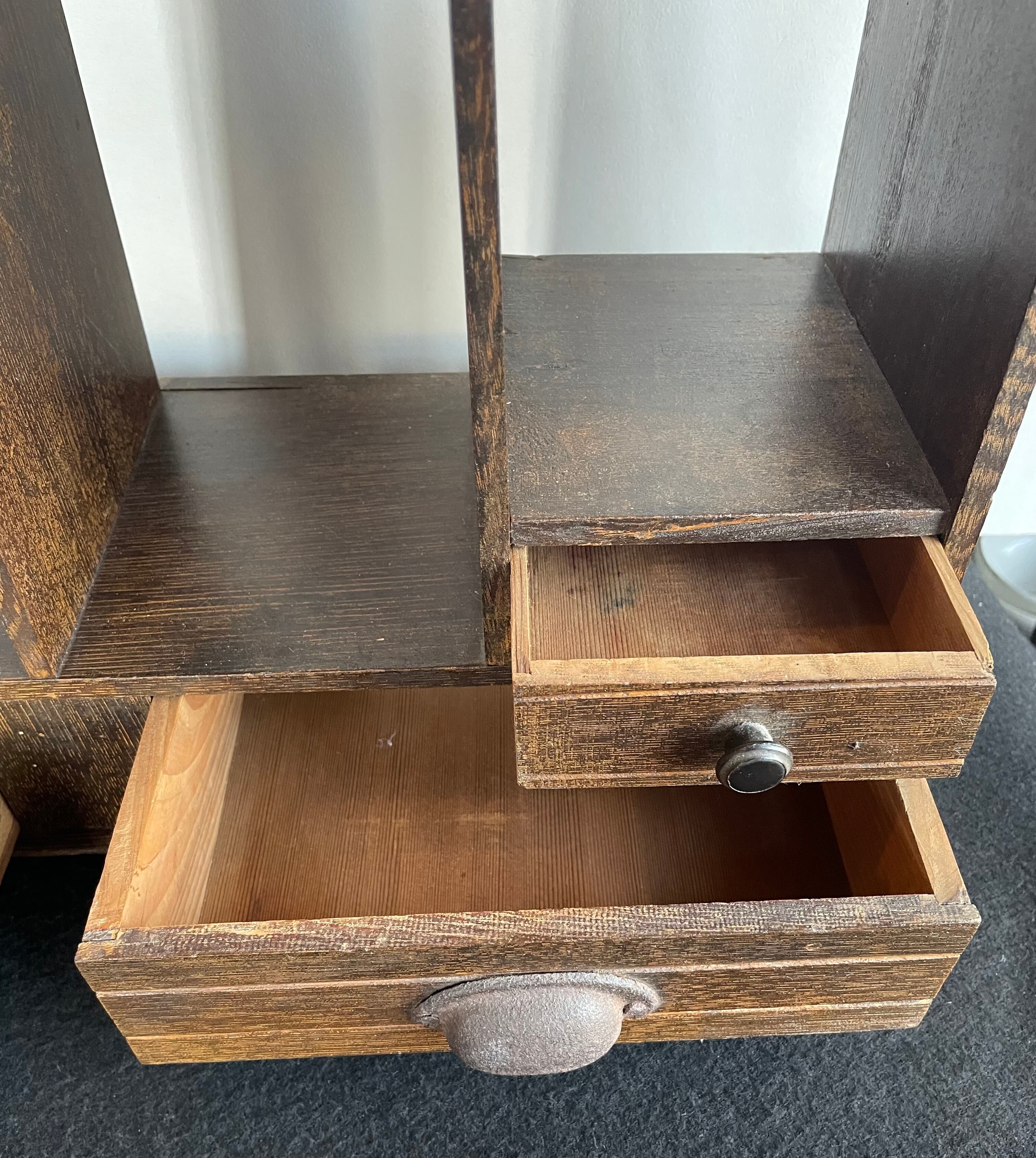 長い時を経て味わいを増した木製ブックスタンド(本棚、本立て、ブックエンド)、大小3つの小引き出し付き。