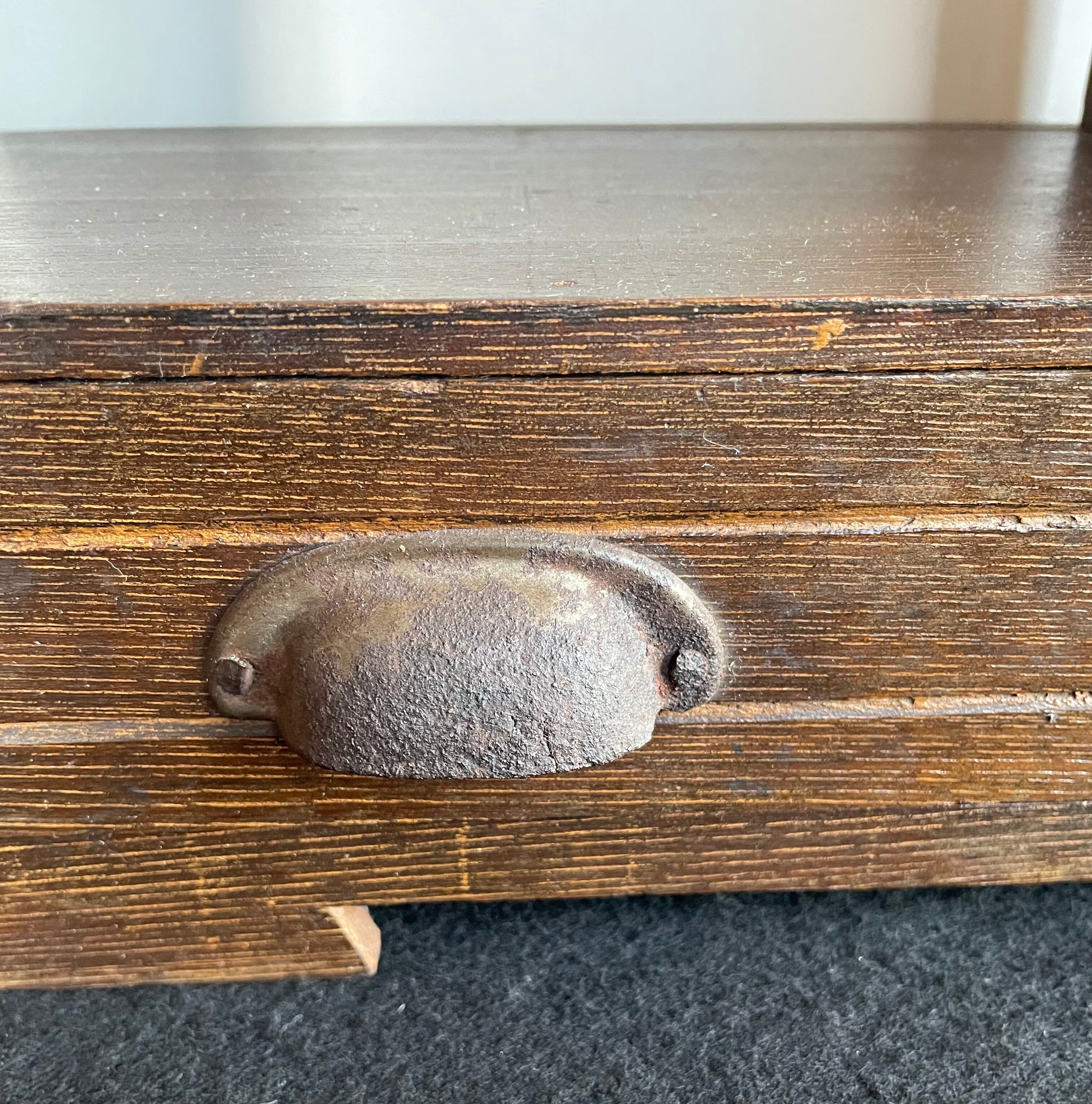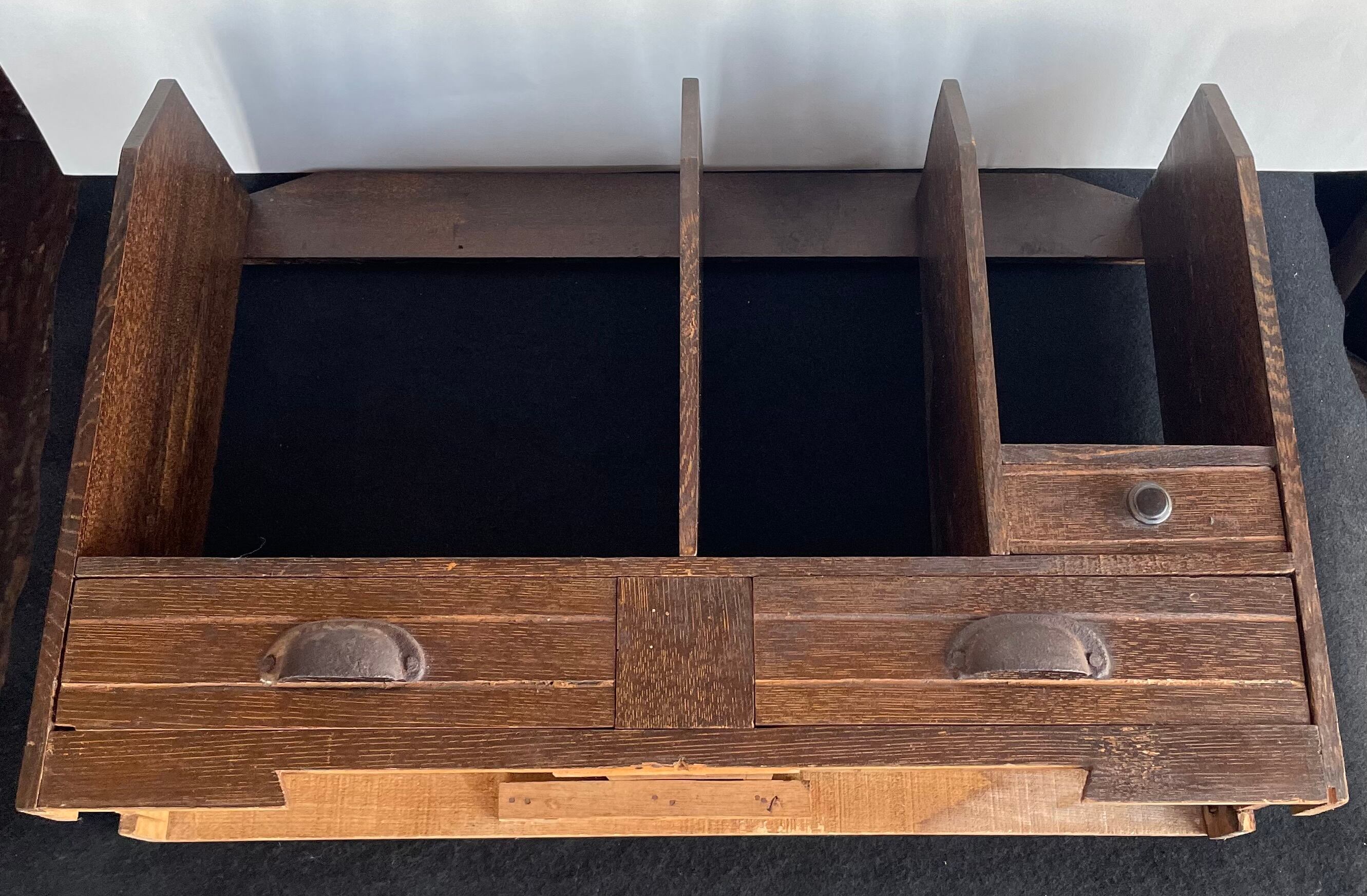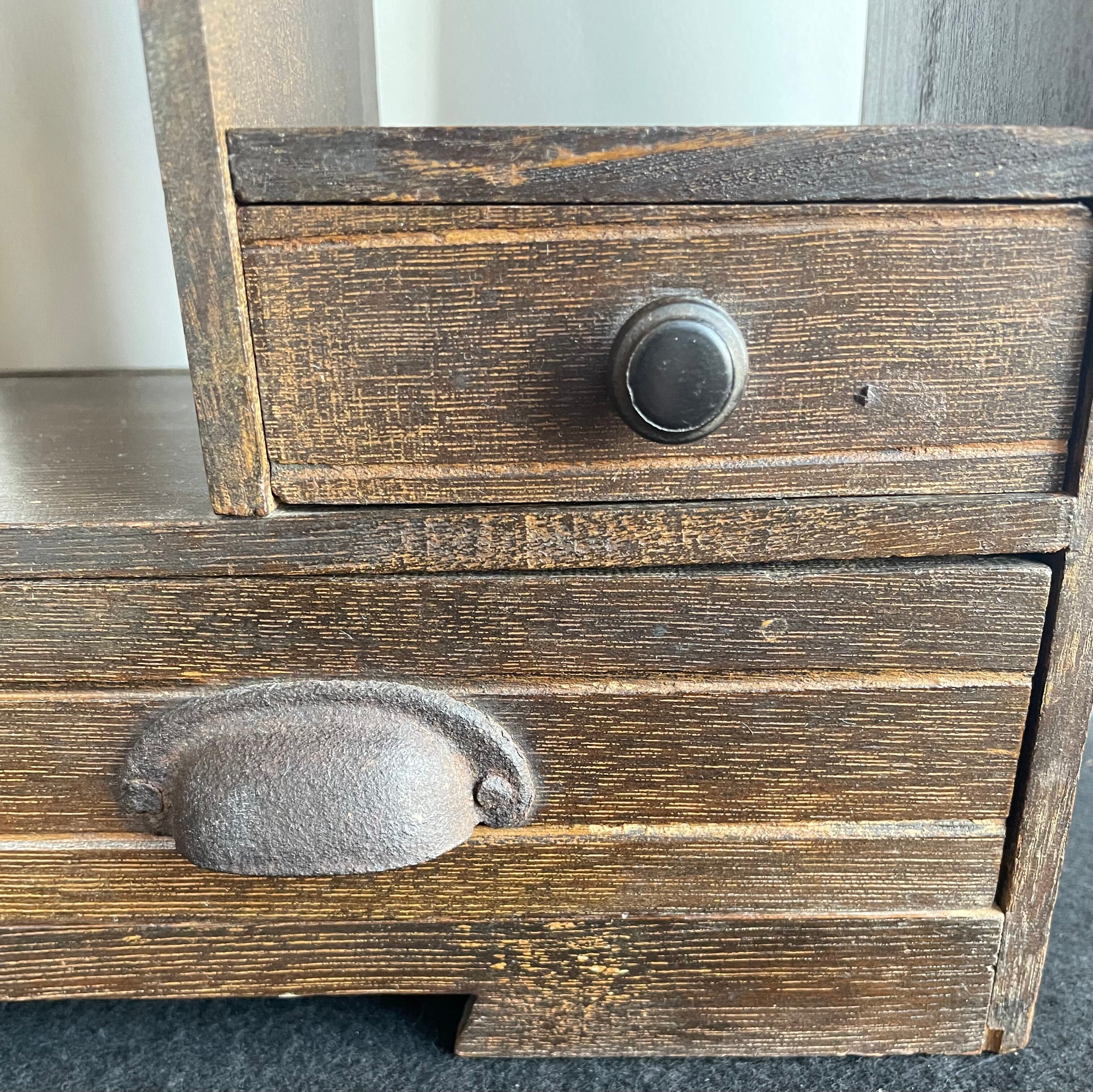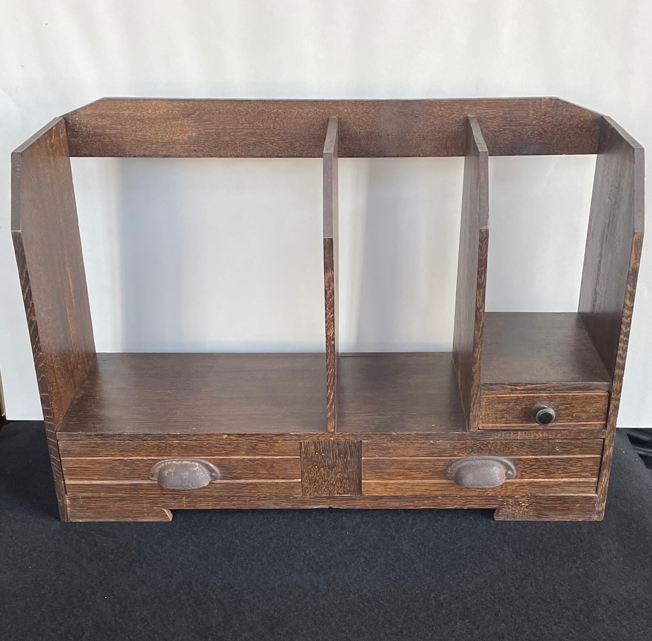 長い時を経て味わいを増した木製ブックスタンド(本棚、本立て、ブックエンド)、大小3つの小引き出し付き。
