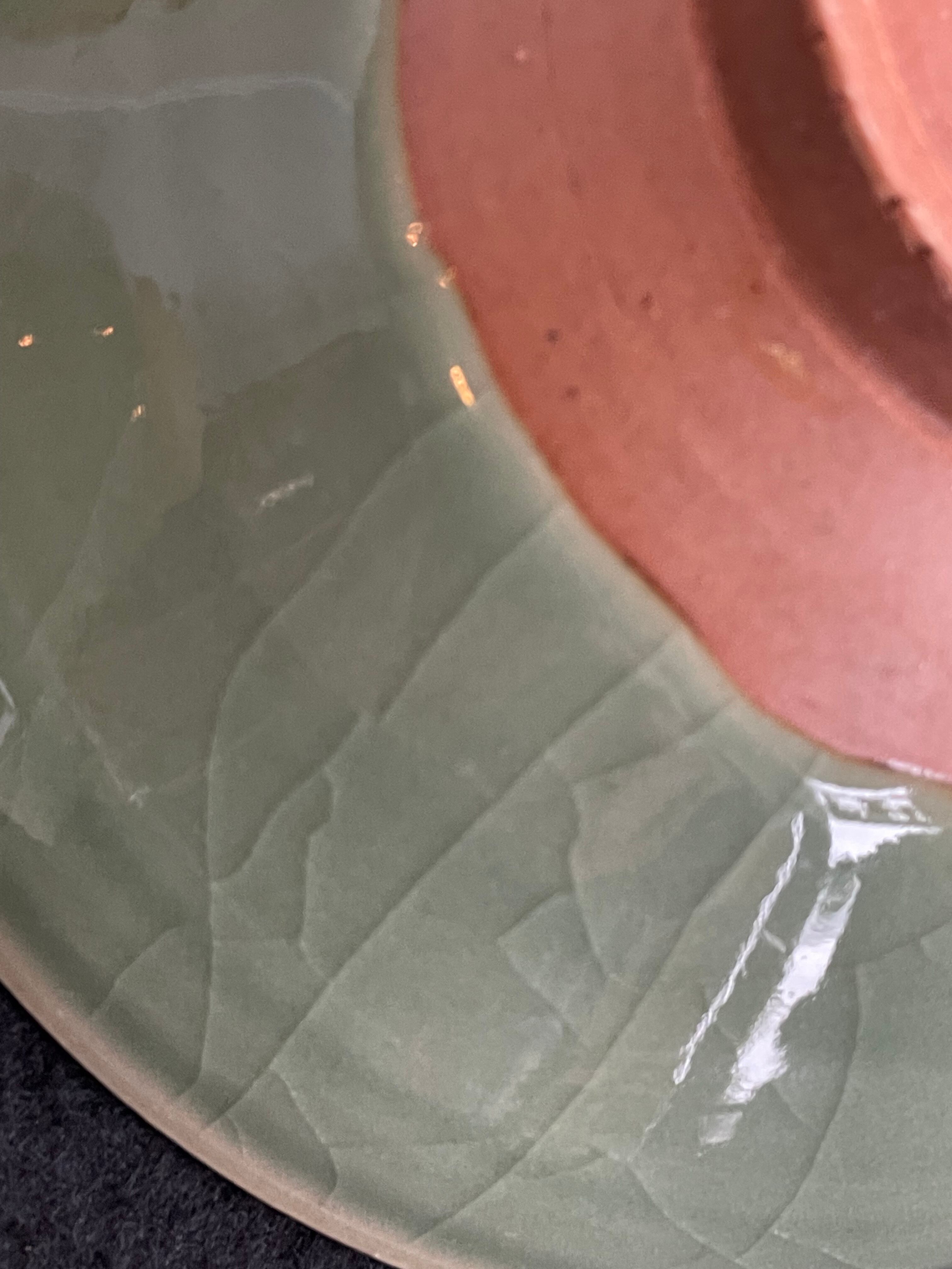 透き通るような緑色(翡翠)のガラス釉薬に入った貫入文が