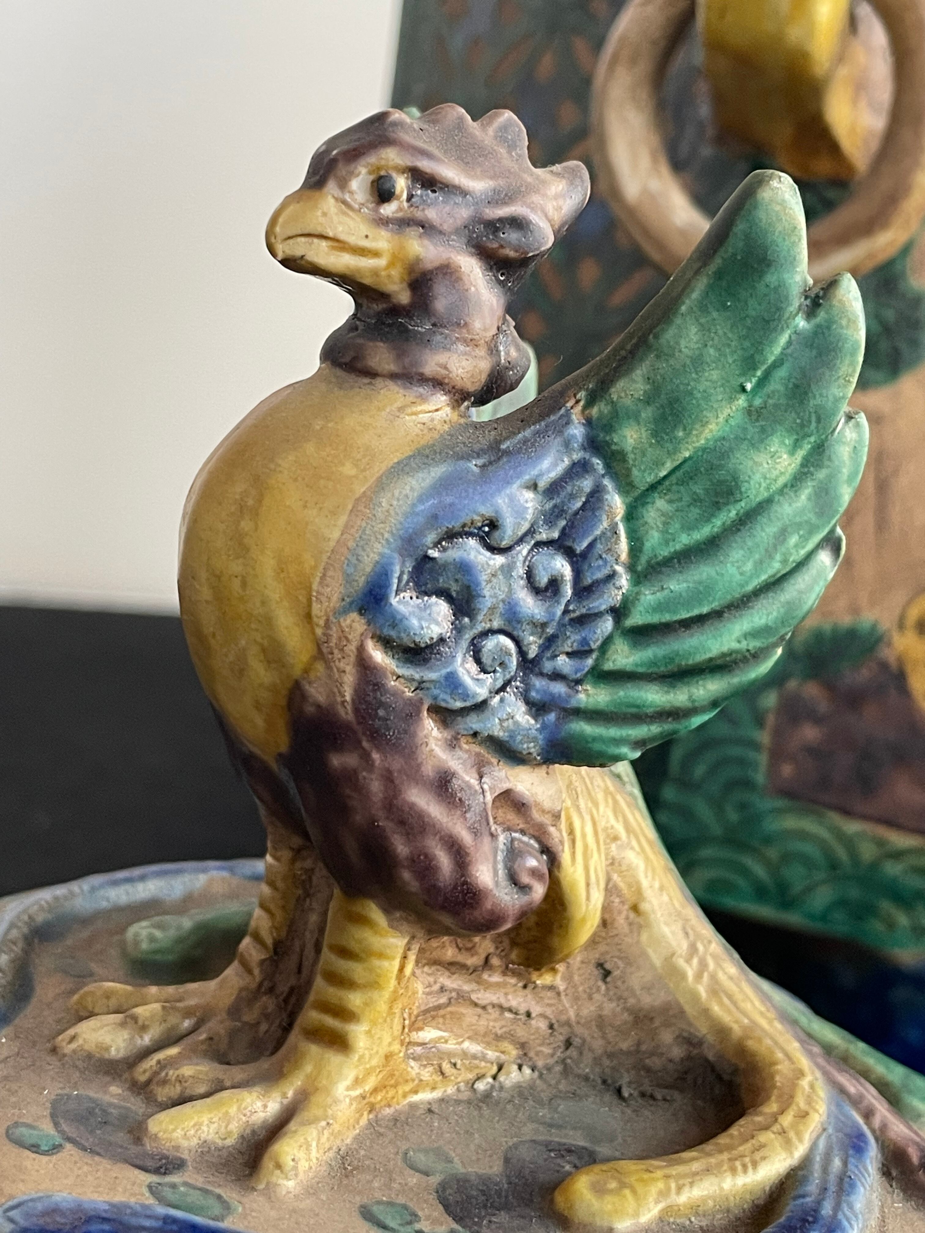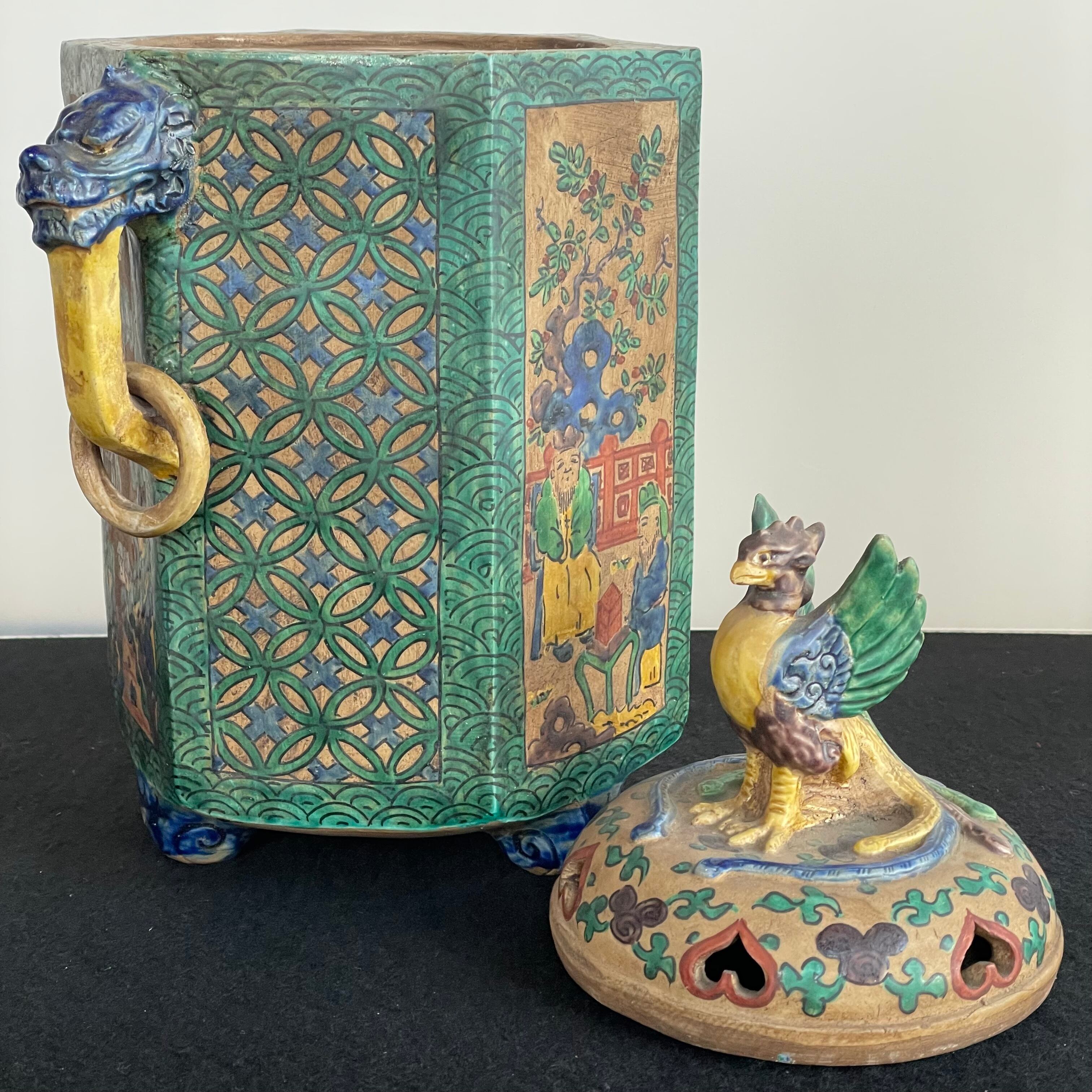 時代 九谷焼 香炉 角福 色絵 獅子 鳳凰 両耳 香道具 茶道具 置物